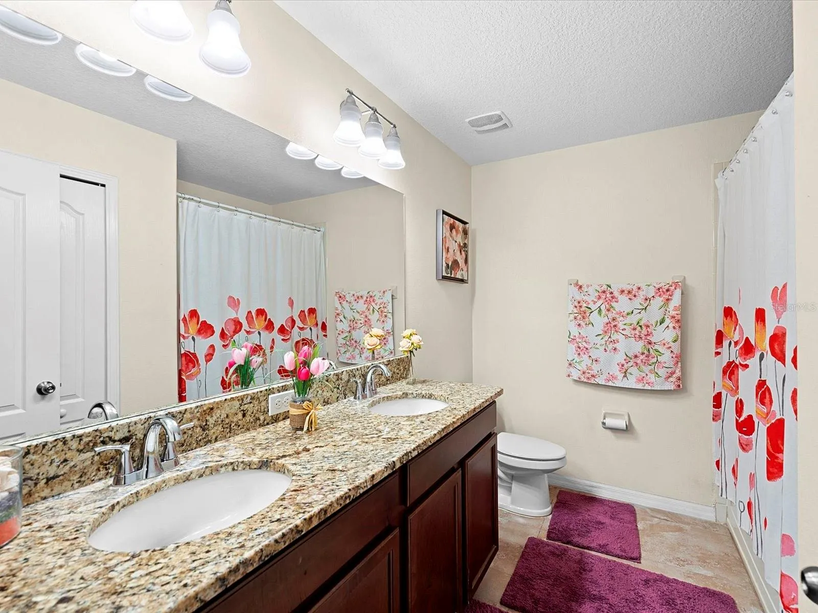 Inside, the home offers a thoughtfully designed layout with the primary suite on the main floor, complete with dual sinks, a walk-in closet, a separate shower, and direct access to the lanai, perfect for morning coffee or evening relaxation. The rest of the first floor is bright and open with an inviting flow, ideal for entertaining. The kitchen shines with stainless steel appliances, maple cabinets, a breakfast bar, and granite countertops, with granite also featured in two additional bathrooms. A water filtration system adds everyday comfort and convenience.