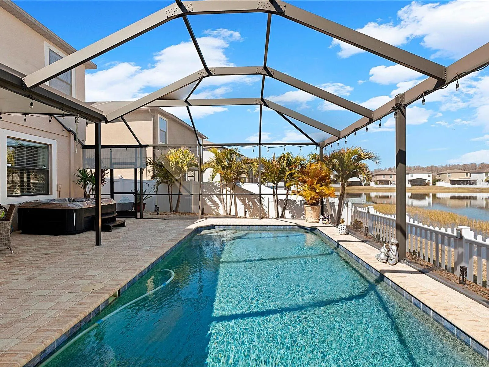 Welcome to this spacious Trinity pool home in the gated community of Trinity Preserve, where peaceful water views and resort-style living come together beautifully. Step out to your large, enclosed lanai and take spectacular sunrise and sunset views over the pond, with visiting birds and other wildlife creating a truly tranquil backdrop. Your outdoor space is designed for easy Florida living, featuring a low-maintenance backyard, pavers, and lush landscaping with palm trees, all centered around a heated, saltwater pool plus a spa/jacuzzi that’s included. For a clean look and added protection, the pool equipment and pump are neatly housed in covered storage, keeping everything organized and visually appealing.