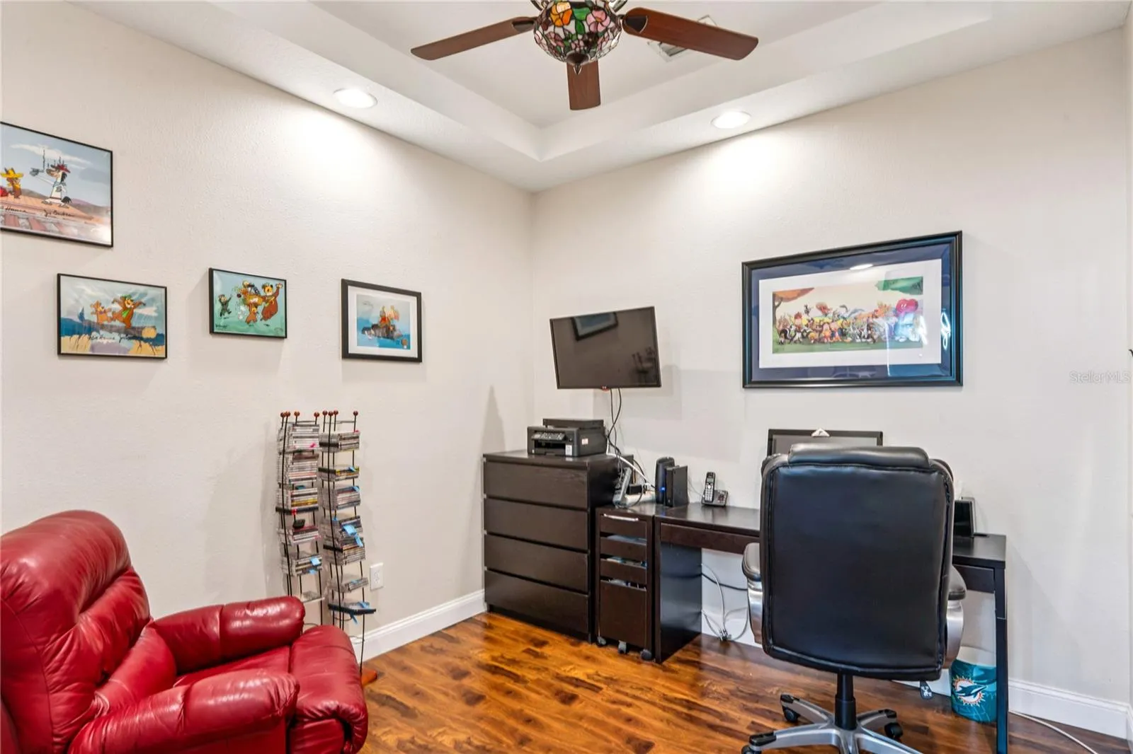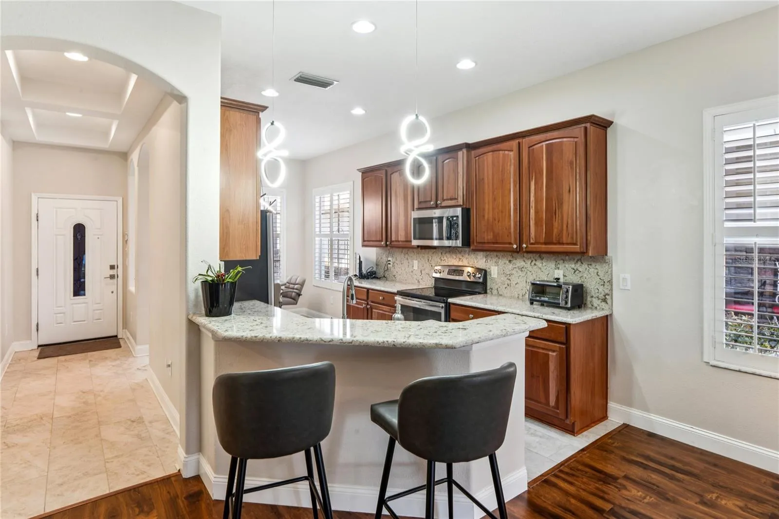 Welcome to the gated Larkenheath enclave of Meadow Pointe! This beautifully maintained 2-bedroom, 2-bath villa with a versatile flex room offers the perfect combination of comfort, functionality, and low-maintenance Florida living. Designed with a desirable split floor plan, this home provides privacy and an open, inviting feel. The spacious primary suite features an oversized walk-in closet with exceptional storage and an en-suite bath with cultured marble countertops. The secondary bedroom and bath are thoughtfully positioned for guests, while the additional flex room offers endless possibilities — ideal as a home office, den, craft room, media space, or guest bedroom. The kitchen is appointed with gorgeous quartz countertops, ample cabinetry, and easy flow into the main living and dining areas — perfect for everyday living and entertaining. Durable laminate flooring extends throughout the main living spaces, complemented by tile in the kitchen, foyer, and bathrooms for added style. Plantation shutters on every window add timeless elegance and enhance natural light throughout the home. Step outside to the screened-in lanai featuring porcelain tile pavers — a peaceful space to relax, enjoy your morning coffee, or host guests year-round. Residents of Larkenheath enjoy convenient access to the Meadow Pointe clubhouse amenities, including a resort-style swimming pool, fitness center, tennis courts, pickleball courts, basketball courts, sand volleyball, and playground. Experience the ease of maintenance-free living in a beautifully maintained gated community close to shopping, dining, and major roadways. Schedule your private showing today!