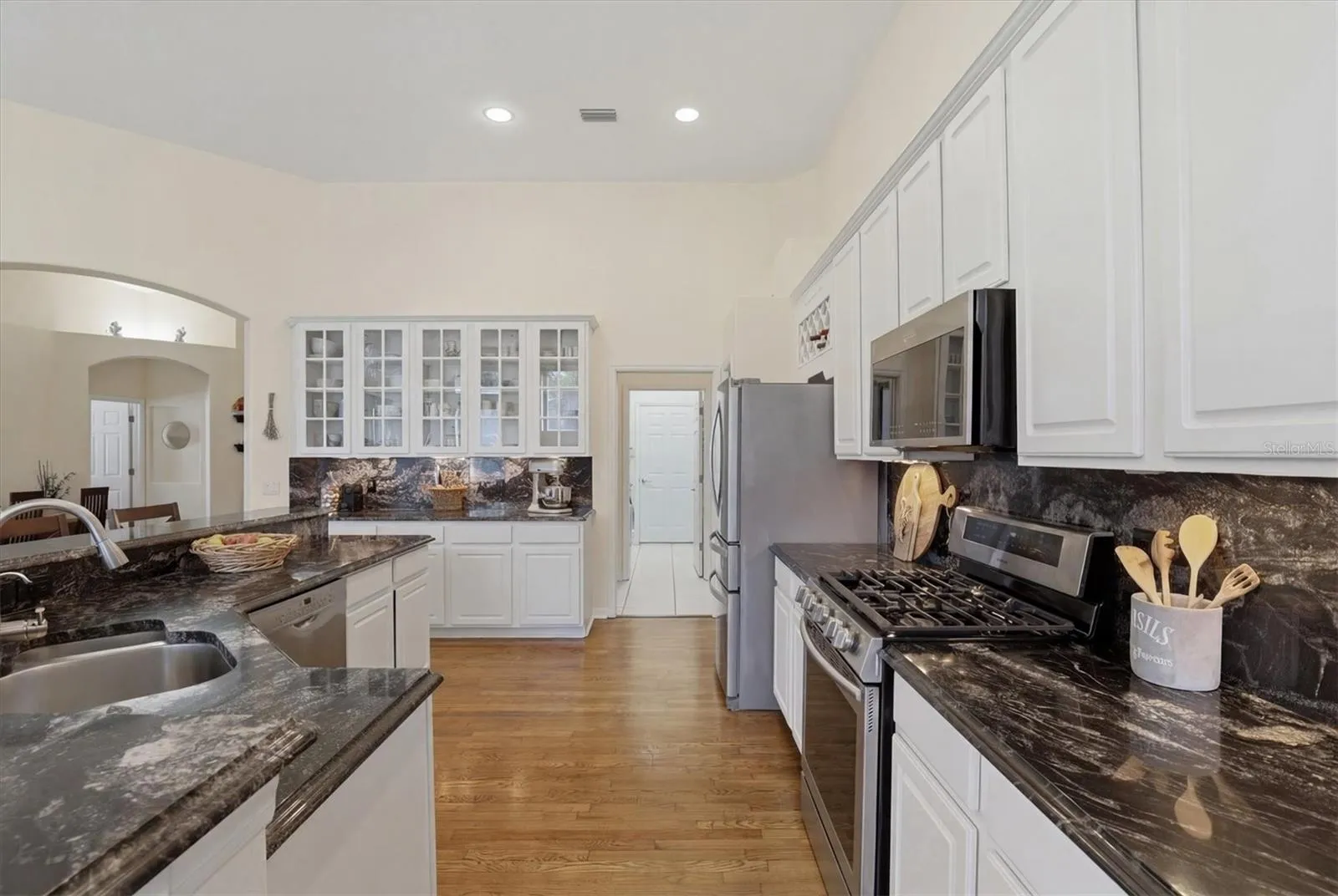 The gourmet kitchen remains the heart of the home, showcasing endless granite countertops complemented by a full granite backsplash, an oversized island designed for gathering and preparation, a dedicated coffee bar, and a generous pantry closet designed for both beauty and function.