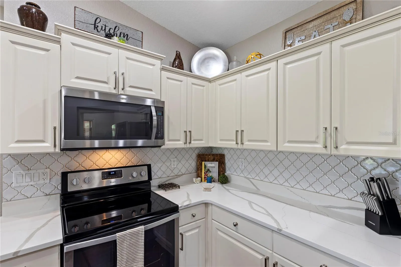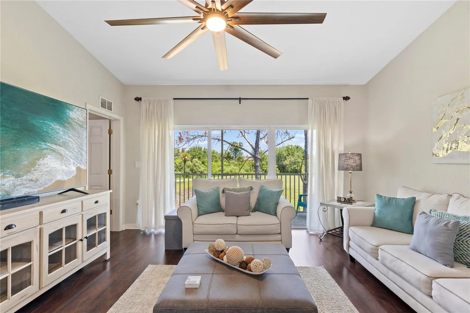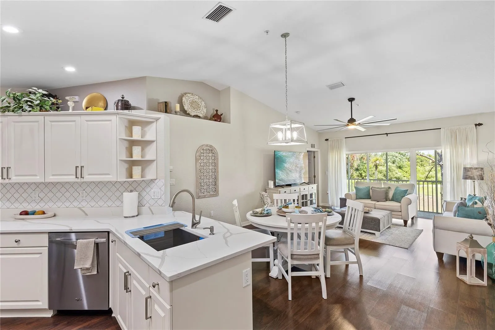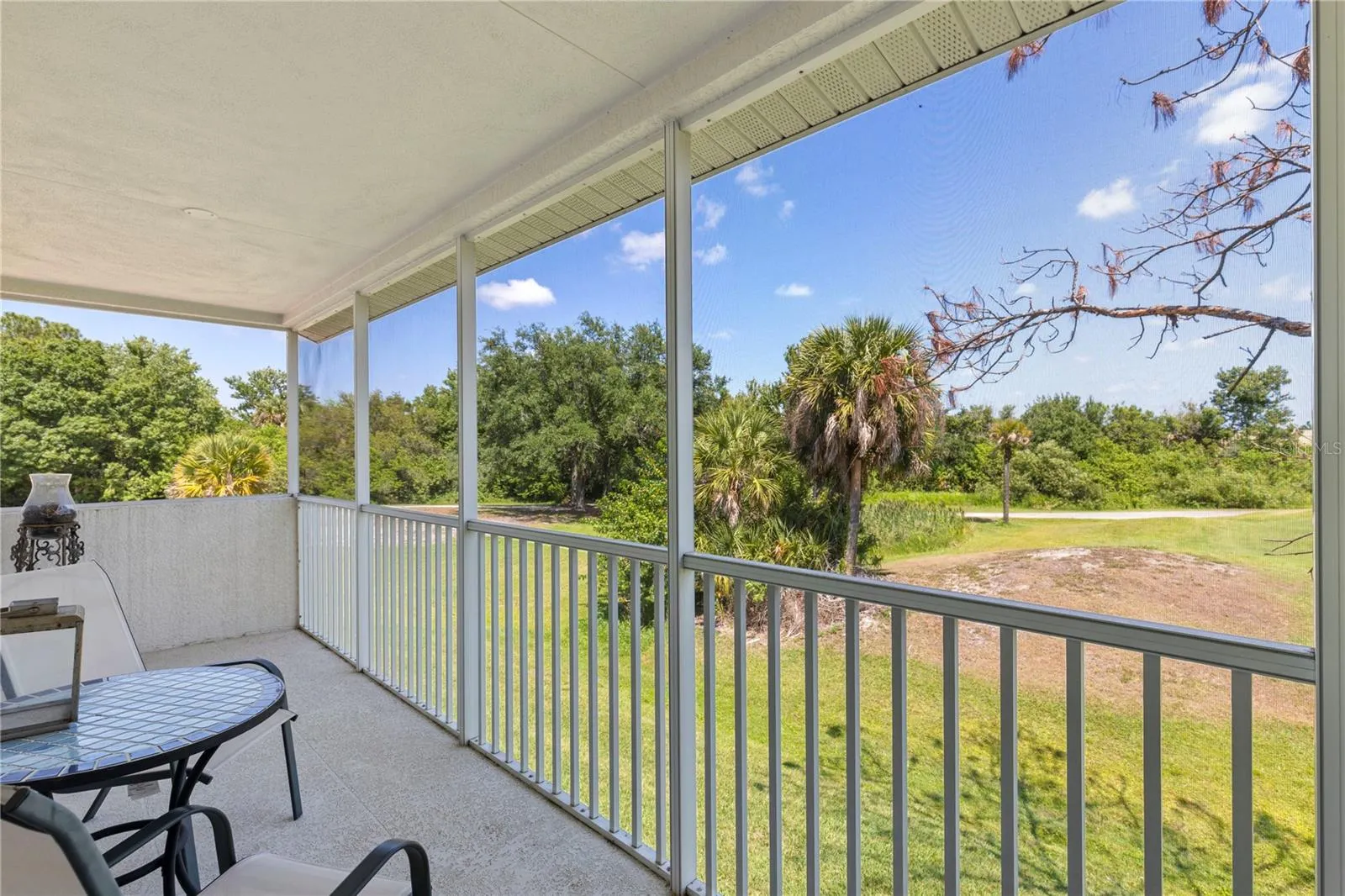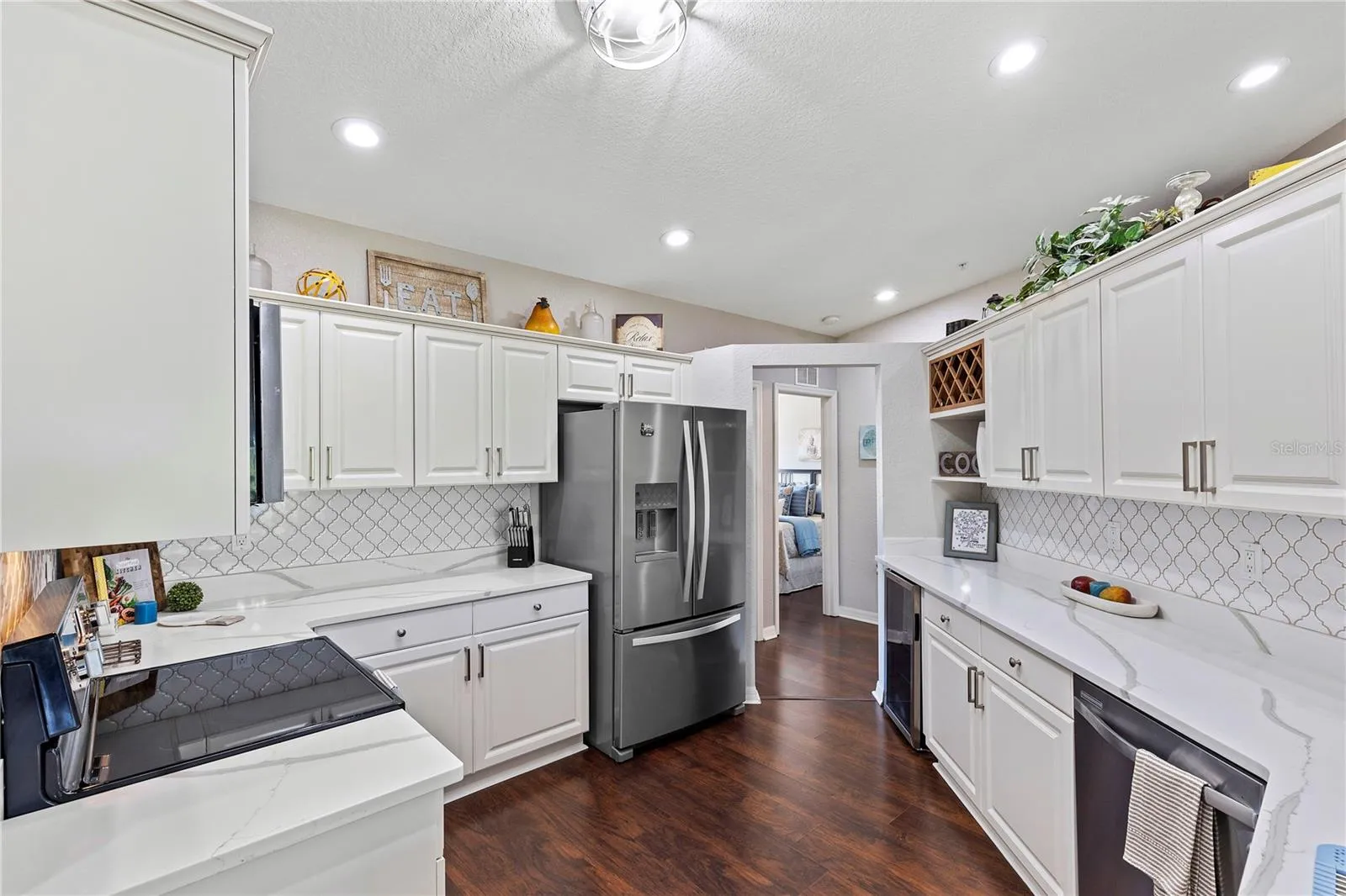 As you step inside, you’ll be greeted by a space that exudes tasteful elegance. Luxury vinyl flooring graces all living areas, including the bedrooms, while the bathrooms feature neutral tile. High ceilings and freshly painted walls adorned with a decorator’s touch enhance the overall ambiance. The kitchen is a culinary delight, boasting quartz countertops, newer stainless steel appliances, and even a wine fridge. Sliders lead from the living area to an outdoor patio that overlooks the picturesque hole 4 of the Tara Preserve golf course, providing a perfect spot for relaxation and enjoying the stunning views.