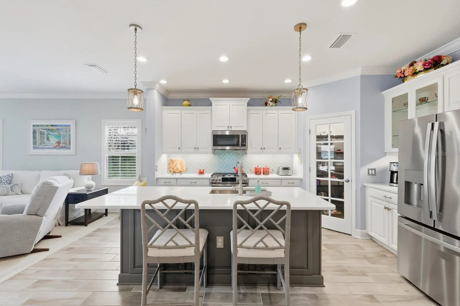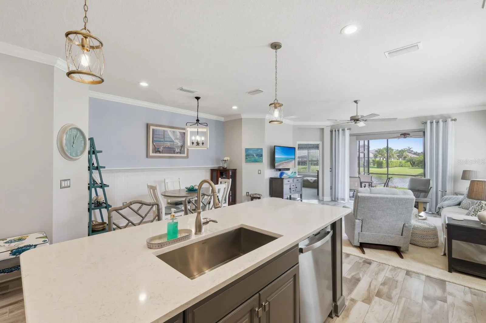 Welcome Home to this exceptional and highly upgraded Villa perfectly positioned with private and serene water views and a large back and private side yard in the Resort style Gated Community of Indigo located in the Heart of Lakewood Ranch. This Villa has a thoughtful, open floor plan that seamlessly connects to the expanded Lanai. It was built in 2021. Better than new! The high-end designer finishes create the perfect atmosphere for entertaining family, friends or daily living. The large Chef inspired Kitchen has custom white wood cabinetry with under cabinet lighting, a lovely Quartz island with sitting area, stainless appliances including gas stove plus a walk-in pantry with wooden shelving . The Dining area is conveniently positioned across from the kitchen and adjacent to the light and airy Great Room with high impact sliding glass doors for peace of mind leading to the expanded Lanai with lovely nature and water views. All main living areas have wood-look tile flooring. The Bedrooms and Den have Upgraded carpeting. Retreat to the Primary Suite with relaxing water views featuring a large Walk-in Closet with custom built-ins and a 2nd oversized closet. The ensuite Bath has dual vanities with quartz counters , white cabinetry and a large walk-in shower. The split floor plans has the 2nd Bedroom nestled toward the front of the Villa with a stylish 2nd Bath featuring white cabinets, tub with shower and private water closet. Nearby is the well equipped Laundry room and storage closet. Opposite is an ample size Flex room perfect as a den, study or extra space for company offering privacy with double herringbone wood doors. Features include Custom window treatments, Plantation shutters, upgraded lights and fans, crown moldings, high impact windows and doors , large 2 car garage and paver drive & walkway. every detail reflex’s quality design, care and comfort. Enjoy effortless maintenance free living! The Villa is walking distance to the Oasis Pool, Spa and Clubhouse which is private for the Villas. The Community Resort style amenities offers a Large Pool/Spa, 5 Cabanas, a Beautiful Clubhouse and Fitness Center, 2 Bocce , 4 Pickleball Courts, a playground and an onsite Activity Coordinator. Located close to top rated schools, the UTC Mall’s shopping and dining, Waterside Place, Sarasota &Manatee cultural and fun events plus our world-renowned Beaches. Location is every thing. Indigo offers the perfect balance of serenity and convenience. Don’t miss this opportunity. Schedule a tour today and make this home yours! You deserve it!