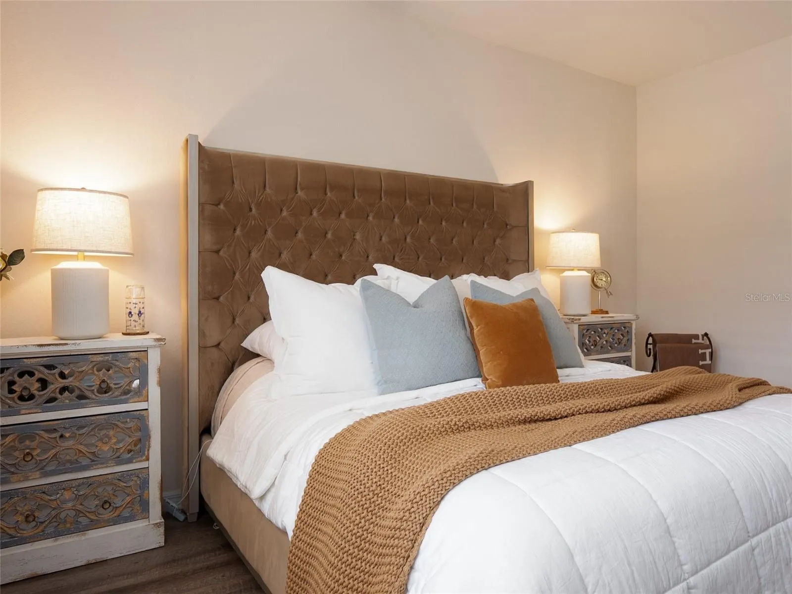 LUXURY LAKEFRONT POOL HOME – 4 BEDROOMS, 3 BATHS, DUAL PRIMARY SUITES, BONUS LOFT This elegantly renovated cul-de-sac residence blends sophisticated style with modern comfort, offering 4 bedrooms, 3 baths, a spacious loft, and two primary suites. Recent upgrades (2023) include: a complete custom kitchen remodel with wine fridge, new dishwasher and range, custom laundry cabinetry, high-end LVP flooring in loft and stairs, electric fireplace, fresh interior and exterior paint, custom accent walls and ceilings, upgraded lighting throughout, enhanced door and closet hardware, garage overhead storage, new salt cell and pool pump motor, and more. The open-concept great room boasts tray ceilings, crown molding, plantation shutters, and peaceful lake views. The upstairs loft offers flexible living space, while the screened 50′ x 24′ lanai with heated saltwater pool creates a private resort-style escape. Community amenities include an 18-hole golf course (no mandatory fees), resort pools, spa, tennis, pickleball, fitness center, and walking trails—minutes to Anna Maria Island, Sarasota, Lakewood Ranch, UTC Mall, and I-75.