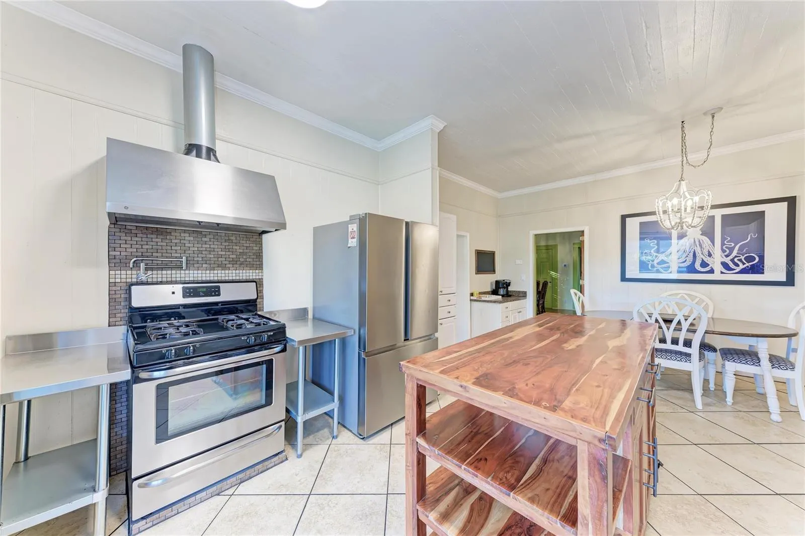 The kitchen is designed for functionality and entertaining, offering ample workspace, an island, and an eat-in area that connects seamlessly to the rest of the home. Upstairs, additional bedrooms and living areas open to a second-floor deck, complete with a spiral staircase leading down to a private backyard retreat.