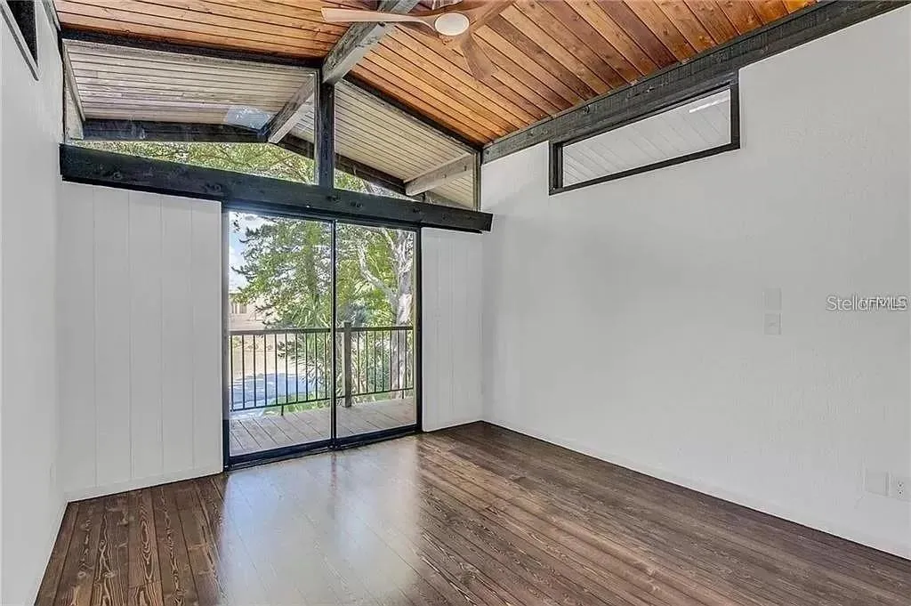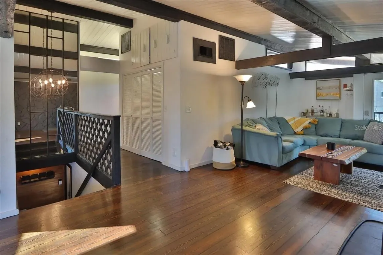 Upstairs, natural light pours through oversized windows and skylights, illuminating the open living and dining areas. Soaring ceilings with exposed beams create a striking architectural focal point, complementing the warmth of the hardwood flooring and the home’s mid-century modern character.