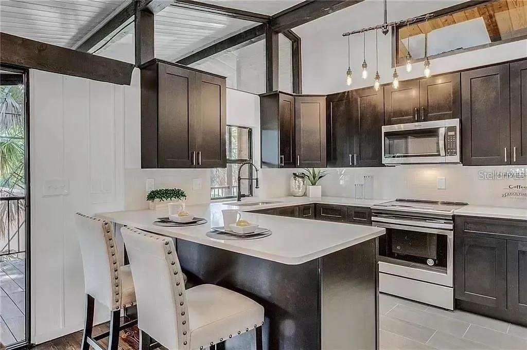 The kitchen has been tastefully updated with quartz countertops, stainless steel appliances, designer lighting, and clean modern finishes, all flowing seamlessly into the main entertaining spaces.