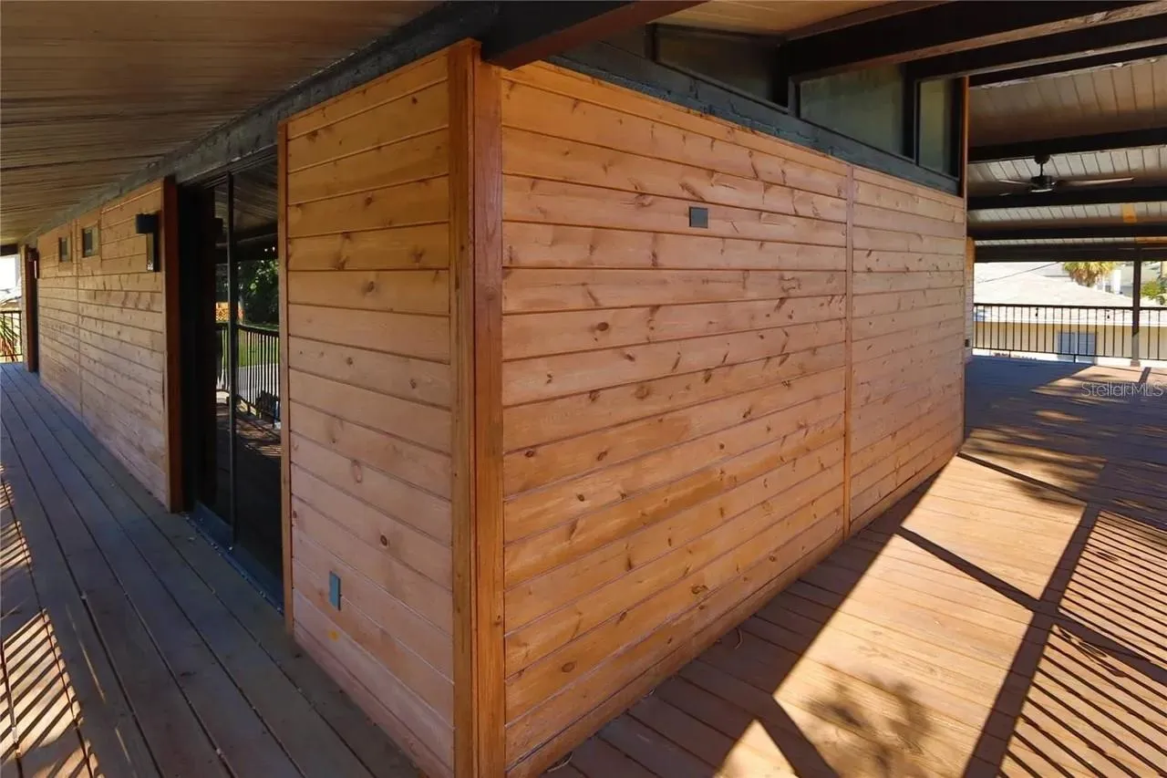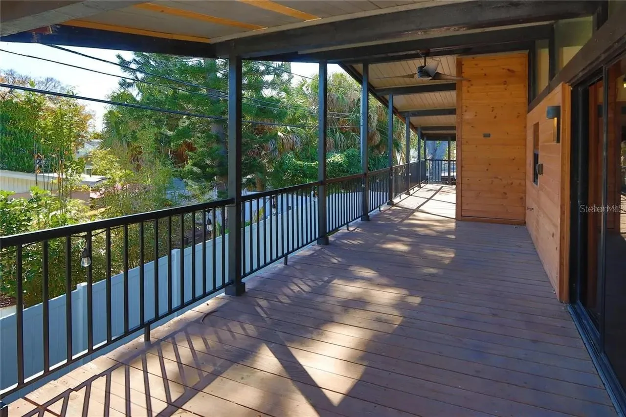 Outdoor living is equally inviting. A spacious wraparound porch accessed by a decorative wrought-iron spiral staircase creates the perfect setting for entertaining, relaxing, or enjoying Florida evenings. The property also features a fenced yard, tropical landscaping, and irrigation improvements.