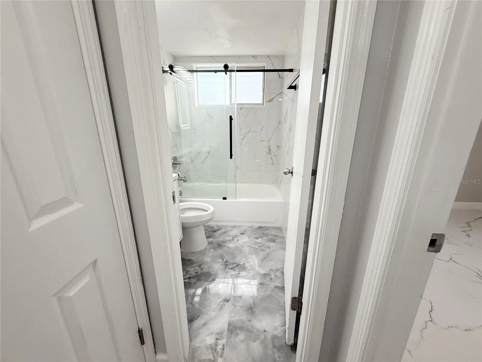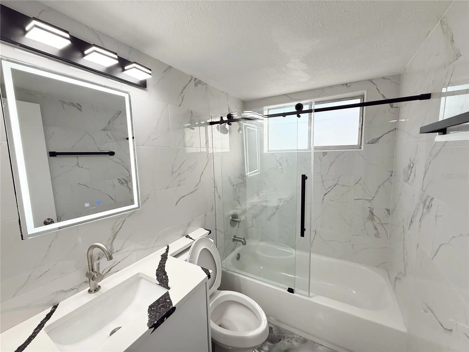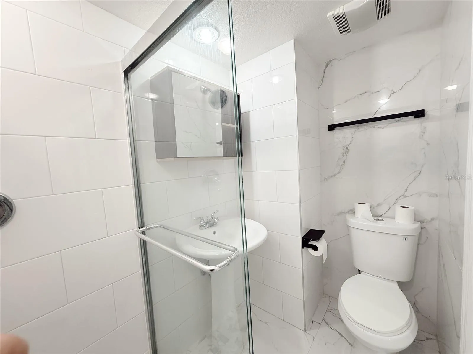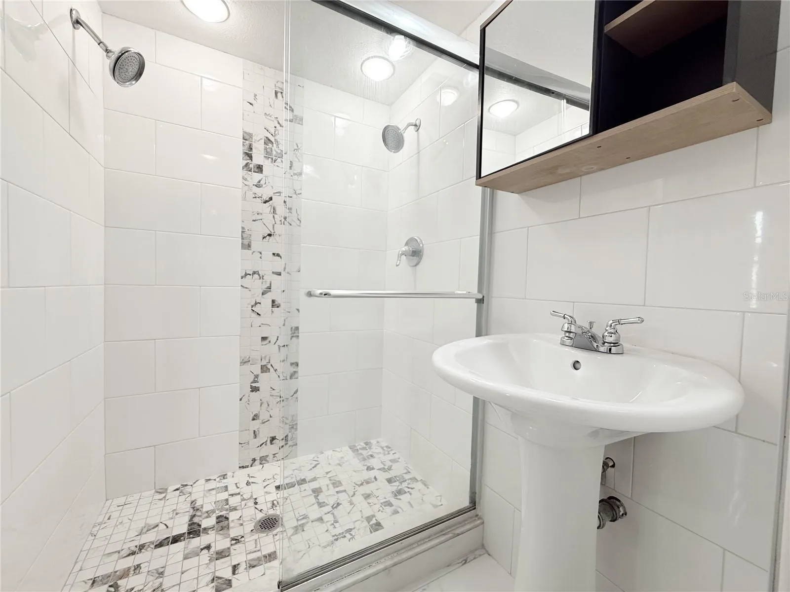 Both bathrooms have been fully renovated with upscale finishes. The primary bath feels like a spa retreat with a step-in shower, floor-to-ceiling mosaic tile, glass door, pedestal sink, and new cabinetry, while the hall bath impresses with a tub/shower combo, custom cabinet with quartz top, illuminated mirror, and floor-to-ceiling modern tile. Brand new Air Conditioning and Water Heater.