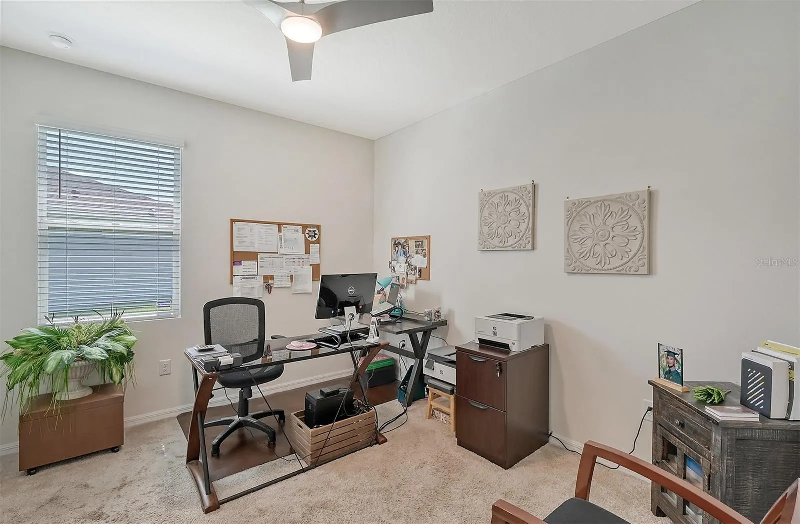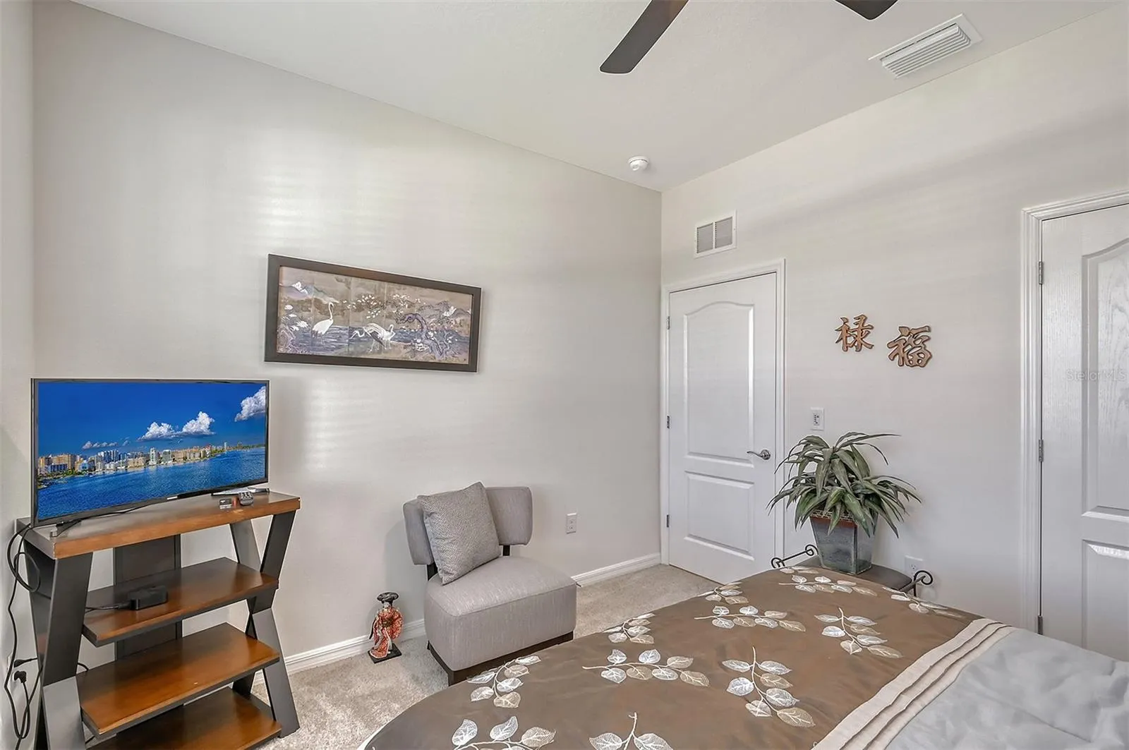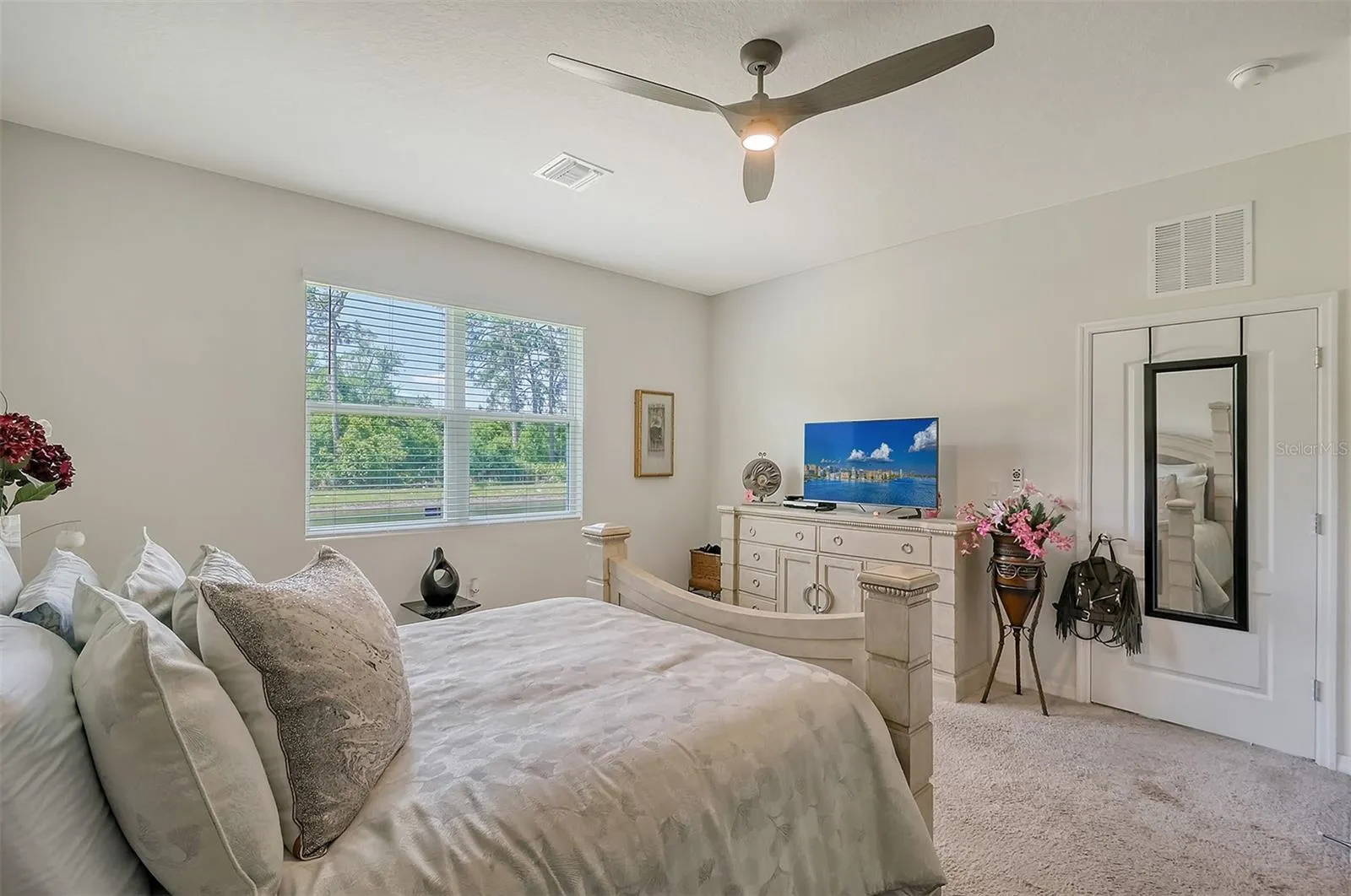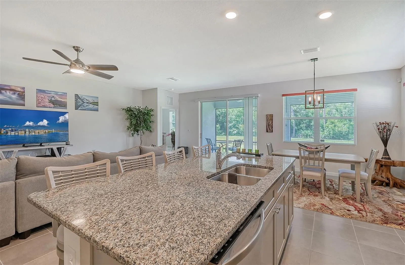 - Ceiling Fans(s), Open Floorplan, Thermostat, Walk-In Closet(s), Kitchen/Family Room Combo, Primary Bedroom Main Floor, Split Bedroom, Window Treatments, High Ceilings, Stone Counters, Solid Wood Cabinets
