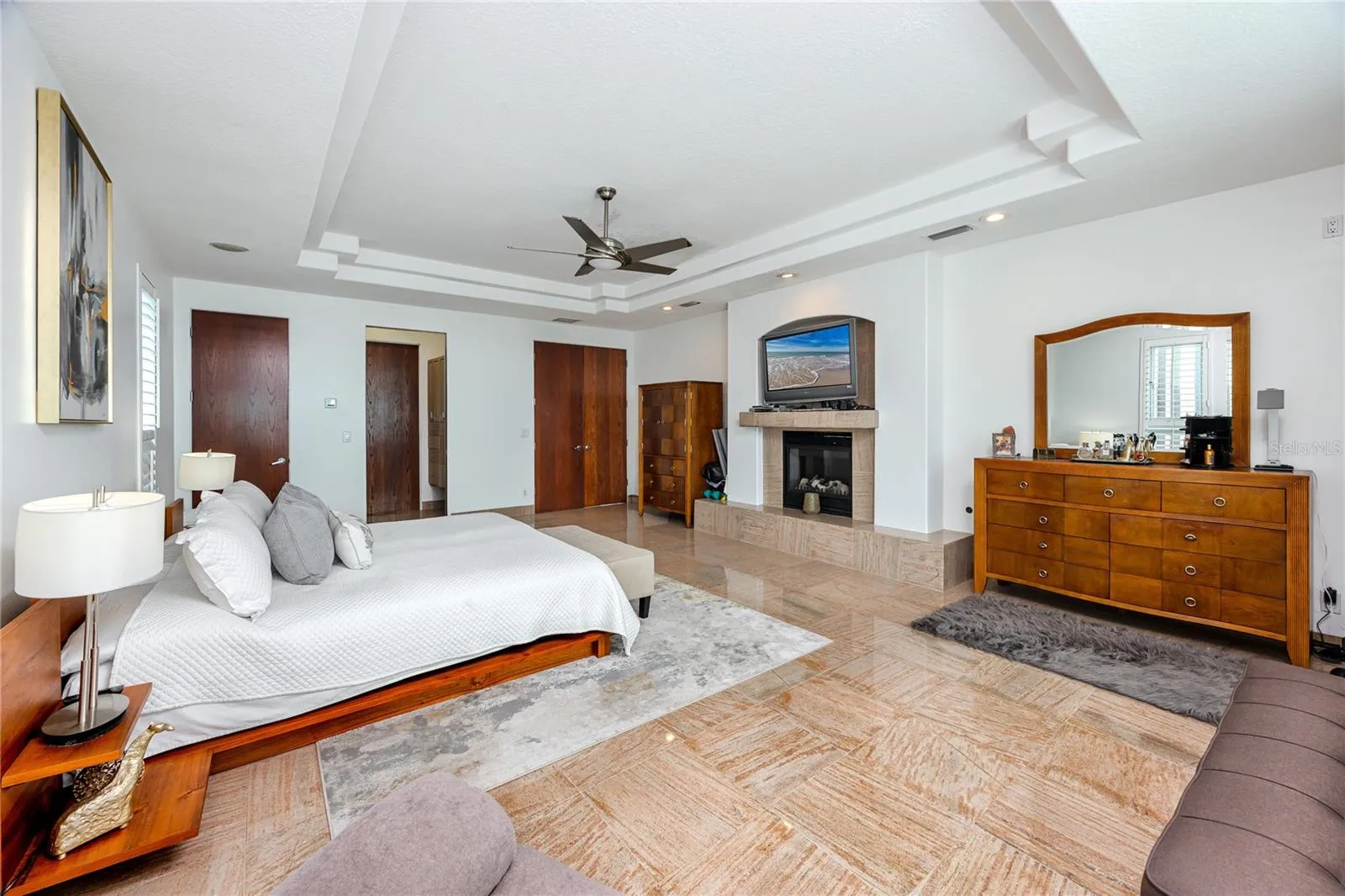 The Primary Bedroom suite is a true sanctuary, complete with a romantic fireplace and a spa-inspired bath featuring a glass-encased shower, a jetted soaking tub, and indulgent designer finishes. Expansive custom walk-in closets and elevated terraces capture sweeping, panoramic bay views, creating an exquisite haven of comfort and sophistication—while a dedicated meditation room on this level provides a serene space for reflection and renewal.