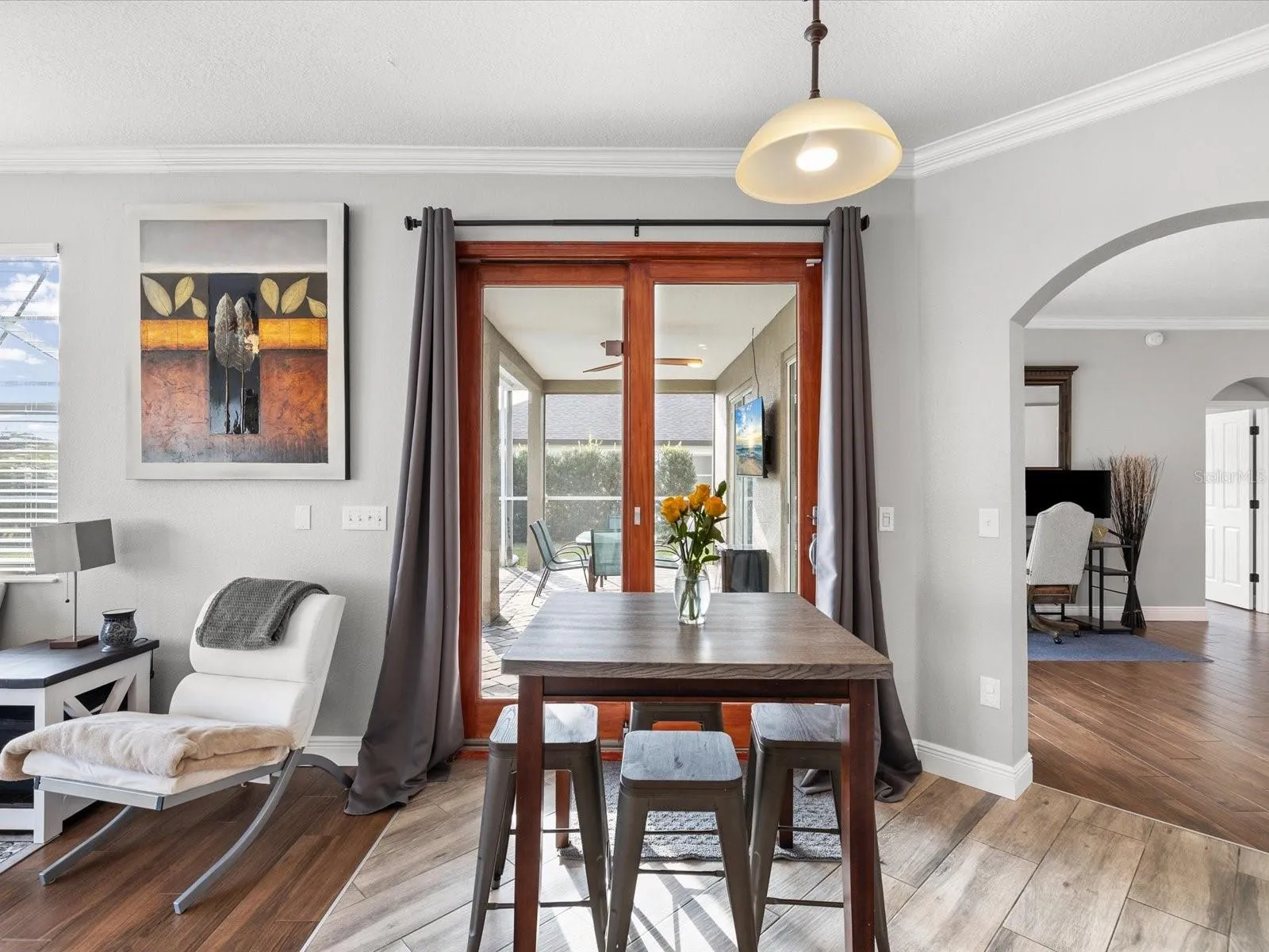 - Ceiling Fans(s), Crown Molding, Open Floorplan, Thermostat, Walk-In Closet(s), Living Room/Dining Room Combo, Window Treatments, Stone Counters, Solid Wood Cabinets
