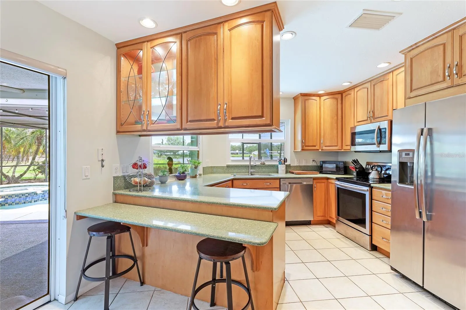 What a GORGEOUS LAKEFRONT view! This is a wonderful opportunity to become the new owner of this Willow Woods 3 bedroom 2 bath pool home centrally located in West Bradenton. A charming front porch leads to a double door entry accented with handsome beveled leaded glass welcoming you into views of the sparkling pool and expansive lake the moment you enter. Generously sized 16′ sliding glass doors overlook the caged saltwater pool & spa helping to invite the outdoors in. This lovely home rests on .45 of an acre! The interior layout offers a foyer entry, family room, living and/or dining area, indoor laundry room with utility sink and a large covered outdoor lanai. The kitchen features two large windows that overlook the back, two pantries, wood cabinetry with a glass display cabinet, a barstool counter and stainless steel appliances. Abundant closet space can be found throughout. Extras include tile on the diagonal, a water softener, 2019 DuroMax generator, newer 2022 windows (16) at a cost of $30K, 2018 roof and gutters, a 2018 A/C with new ductwork, interior and exterior painted 3 years old, garage storage racks and a front door roll down shutter. You also have the option to install your own dock with County approval. A sprinkler system equipped to utilize lake water will save you $$$ on your utility bill. This special home, with its larger doorways and lack of steps, was designed to be accessible for disabled persons. This location is simply fantastic and central to all your shopping, dining and medical needs and just about 6-7 miles away for you to arrive at Bradenton’s famous sandy beaches. Enjoy living in a non-deed restricted community with no CDD or HOA fees or pet restrictions. One very lucky homeowner will be claiming this special home as theirs!