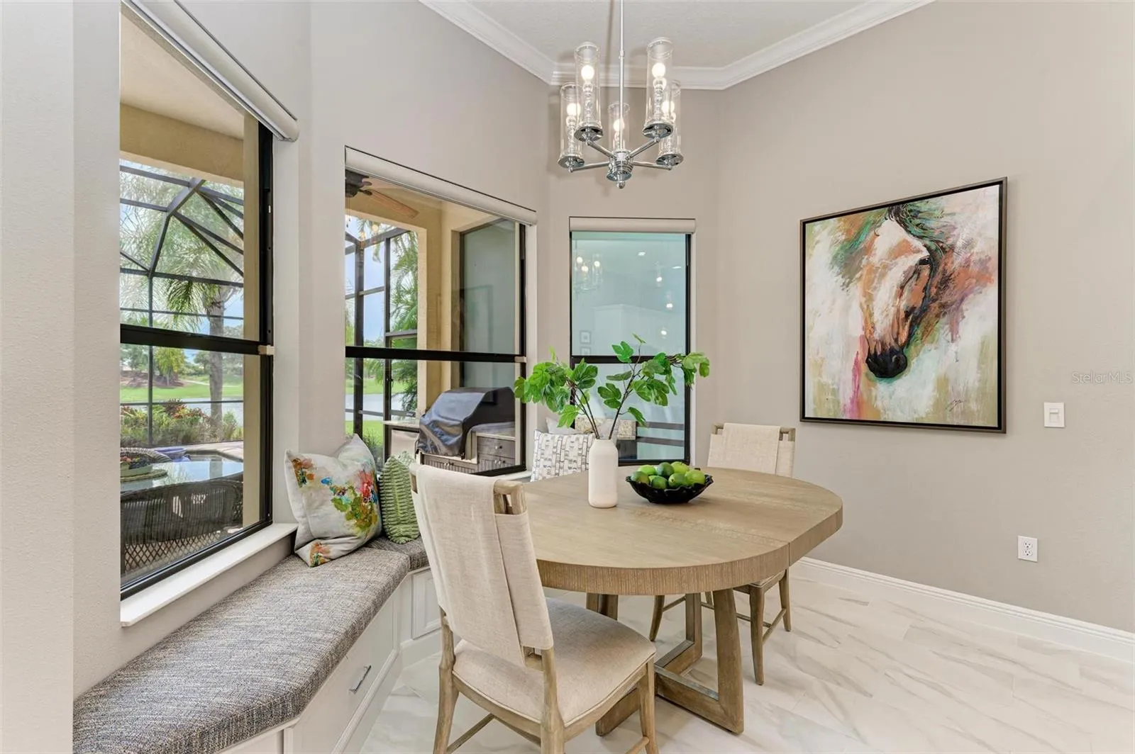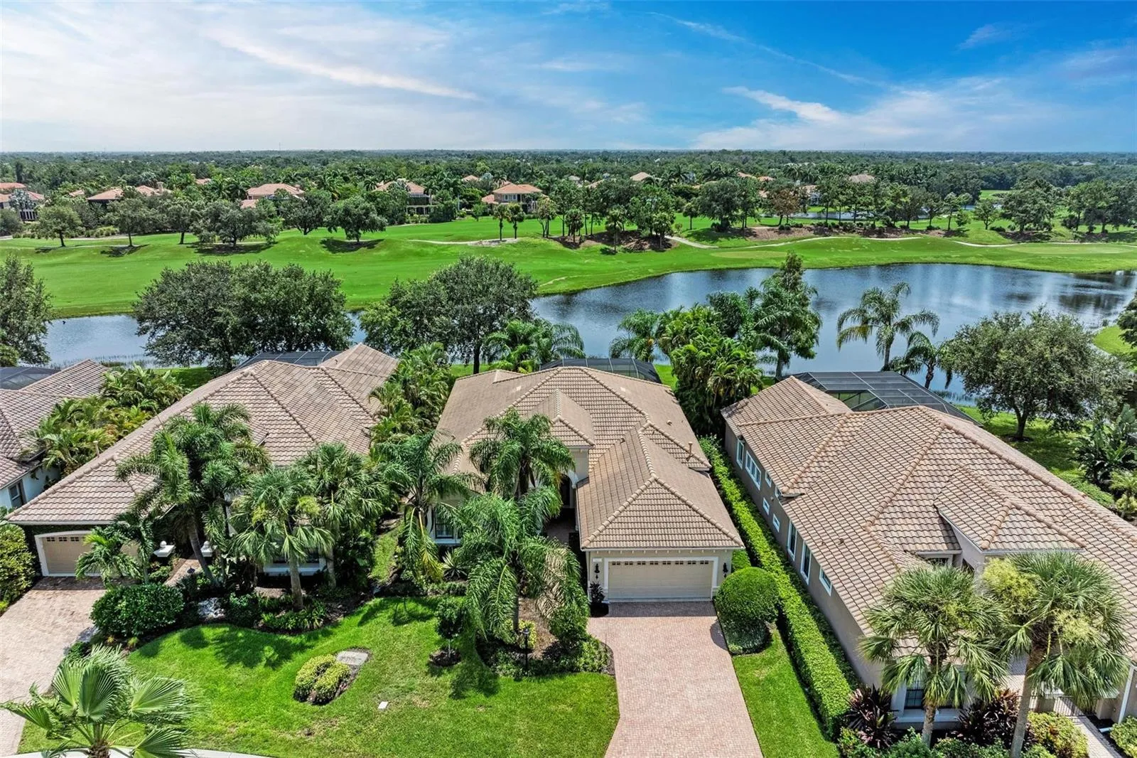 This precious gem of a home is situated in the highly coveted Stone Ridge neighborhood within the gates of the Lakewood Ranch Country Club, close to the driving range, Golf Pro Shop, and the main Country Club. Upon arrival, you are captivated by the stunning views of tropical beauty, a lovely pool area with a soothing waterfall, expansive lake views, and the picturesque King Dunes golf course designed by Arnold Palmer. This Aviano model by Neal Communities is a showstopper. The open great room features soaring ceilings adorned with crown molding, built-in speakers, abundant natural light, a wall-to-wall custom built-in entertainment bookcase, three disappearing sliding glass doors with automated shades, and new tiled floors flowing through all main rooms. The elegant dining area showcases an exquisite chandelier, lighting sconces, and an arched window with plantation shutters. The recently updated gourmet kitchen boasts an extended wet bar area with a built-in wine refrigerator, a waterfall island with ample storage and a hidden extending table, new stainless-steel appliances, a slide-in natural gas stove, and a built-in wall oven/microwave. The kitchen also features new backsplash accents and a window with a remote-controlled shade. The adjoining breakfast room includes a built-in window seat with storage, custom cushions, and charming views of the pool, lake, and golf course. The expansive primary suite features an 8-foot double door entry, access to the pool area through another set of double doors, two large, customized closets, and an en-suite bathroom with a whirlpool tub, two separate vanity areas, a large walk-in shower, and a door to the lanai serving as the pool bath. The other wing of the house includes a den with double 8-foot French doors, crown molding, baseboards, and a front window with plantation shutters. Two guest bedrooms share an updated bathroom, with one featuring a Murphy bed and customized closet. The laundry room has been updated with custom cabinets, Whirlpool front-loading washer/dryer, and a built-in laundry sink with quartz countertops. The extended garage offers a workstation and additional storage. The picture-perfect outdoors includes a large, covered area with a fully equipped summer kitchen and mini refrigerator flanked by a privacy screen. The electric heated pool has a waterfall and a large planter. The entire lanai screen was replaced in 2022, and the patio furniture is included. Interior furniture is available by separate agreement. HOA includes landscaping maintenance, gated entrances, cable TV, irrigation, and common areas. There are no mandatory club memberships to live here, but residents can join the Lakewood Ranch Club for access to four golf courses, two outstanding clubhouses, pools, fitness facilities, tennis, pickleball, and more. Lakewood Ranch is the #1 multi-generational community in the U.S. for six years running. Don’t delay; this rare opportunity to own a great home won’t last long!
