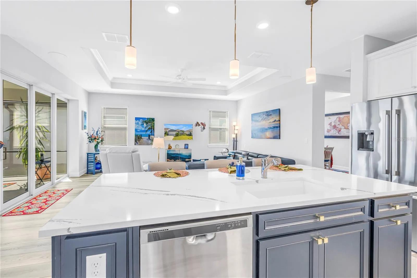 Welcome to 8721 Ocean Tides Drive, an exceptional and rarely available 3-bedroom Mystique model located in the highly desirable Del Webb Bay View, a vibrant 55+ active-adult community known for its resort-style lifestyle and beautifully maintained surroundings. Perfectly positioned on a tranquil pond, this residence offers a refined blend of luxury finishes, thoughtful design, and everyday comfort. Upon entry, the home showcases elegant tray ceilings, crown molding, and high-end upgrades throughout, creating a bright and sophisticated atmosphere ideal for both entertaining and relaxed living. The open-concept design enhances natural light and maximizes the home’s spacious feel.