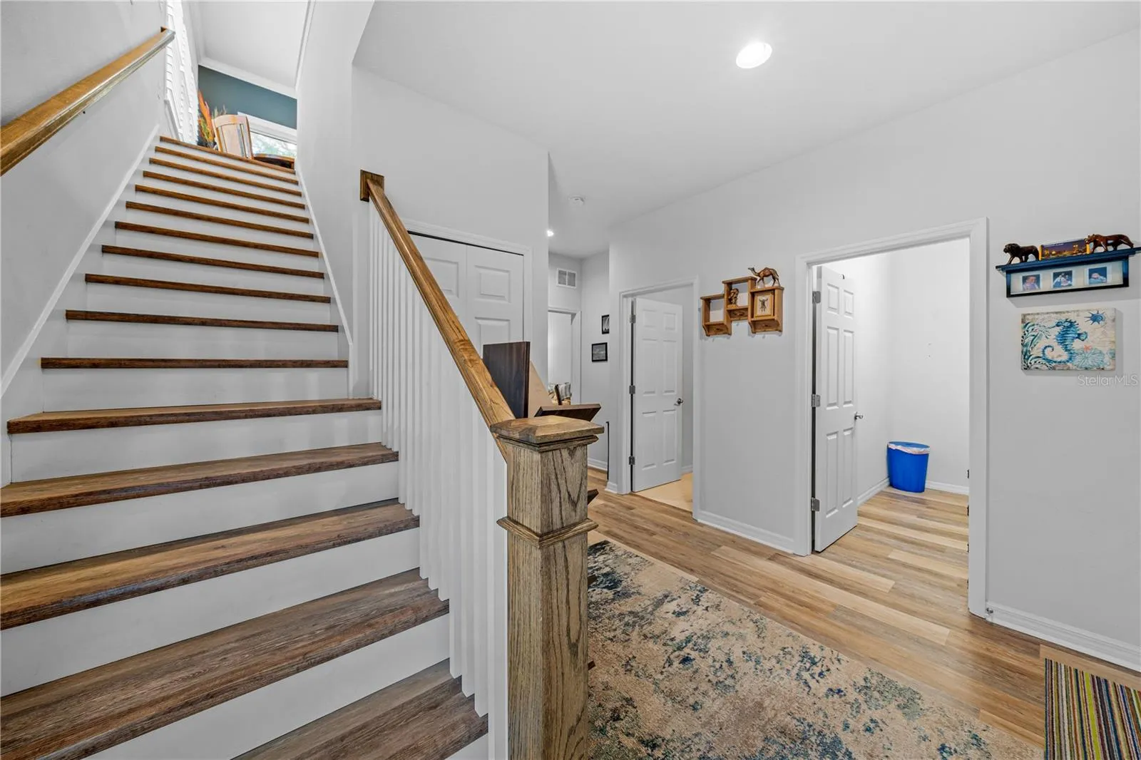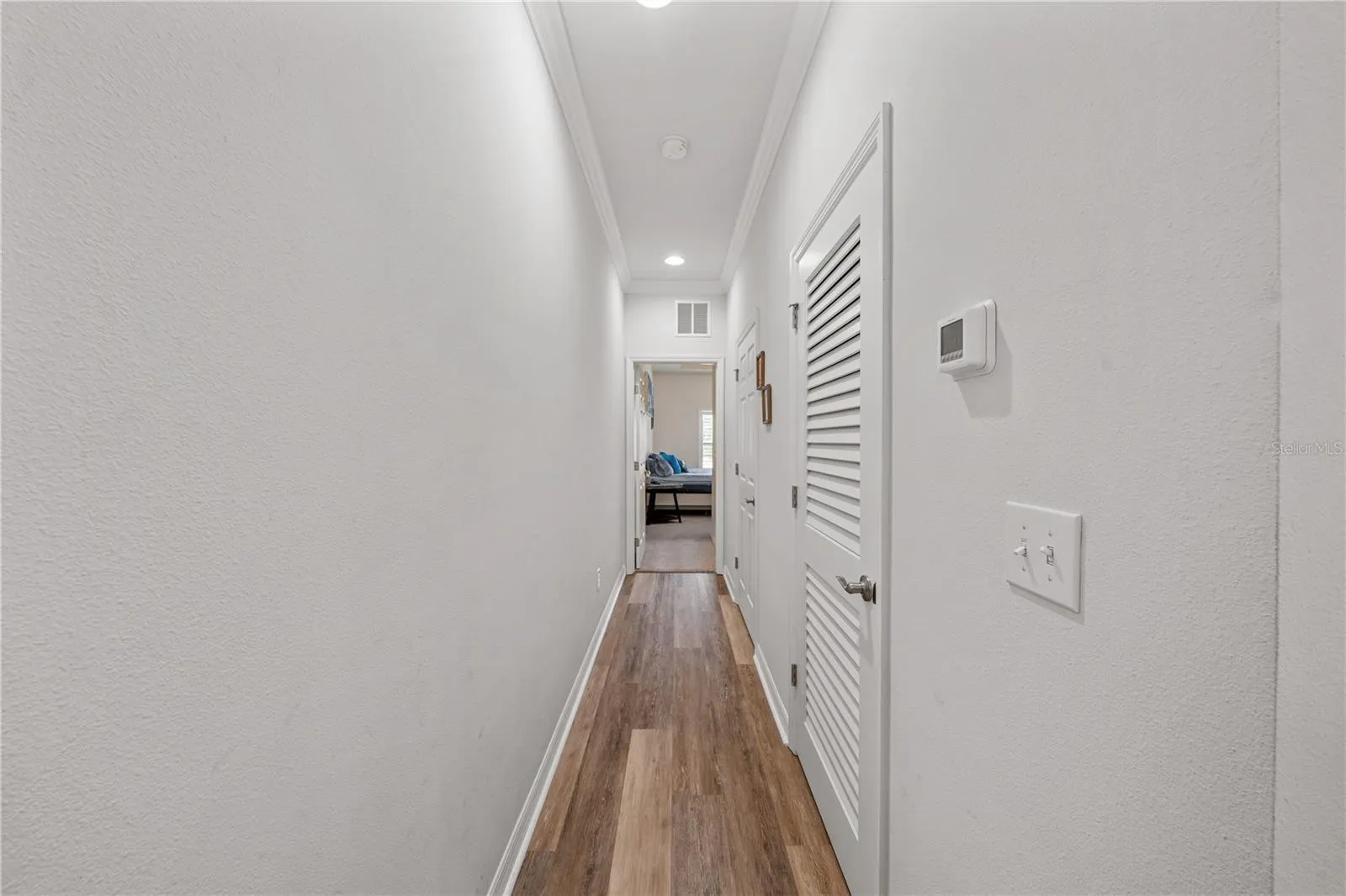 As we head down the hallway to the primary bedroom you will notice architectural detail overhead with the arch before reaching the powder bath with pedestal sink. Again the LVP is carried throughout the upstairs living areas and bath. Other details include plantation shutters, crown molding, recessed lighting.