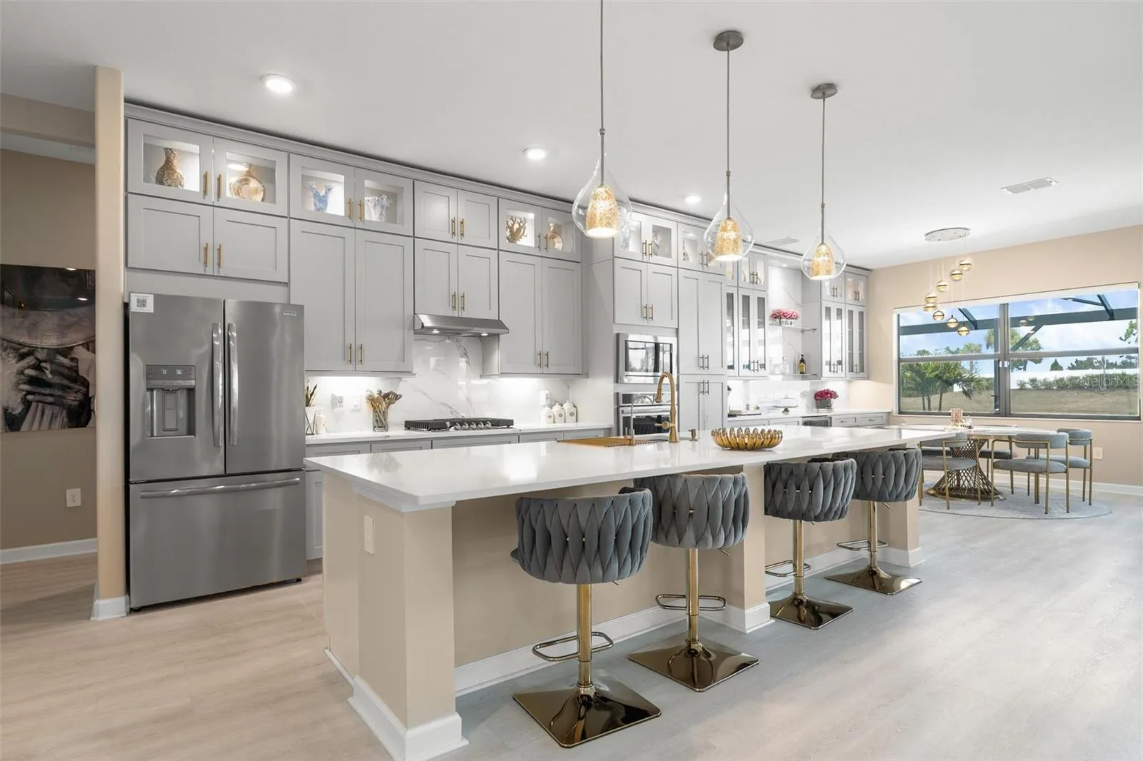 This home has been completely upgraded beyond the builder’s finishes. The custom kitchen was redesigned with an extended bar that opens into the dining area, creating a more functional and inviting layout for everyday living and entertaining. New luxury vinyl plank flooring runs throughout the home, and the living room features a striking accent wall with an electric fireplace that can be used for ambiance or heat.