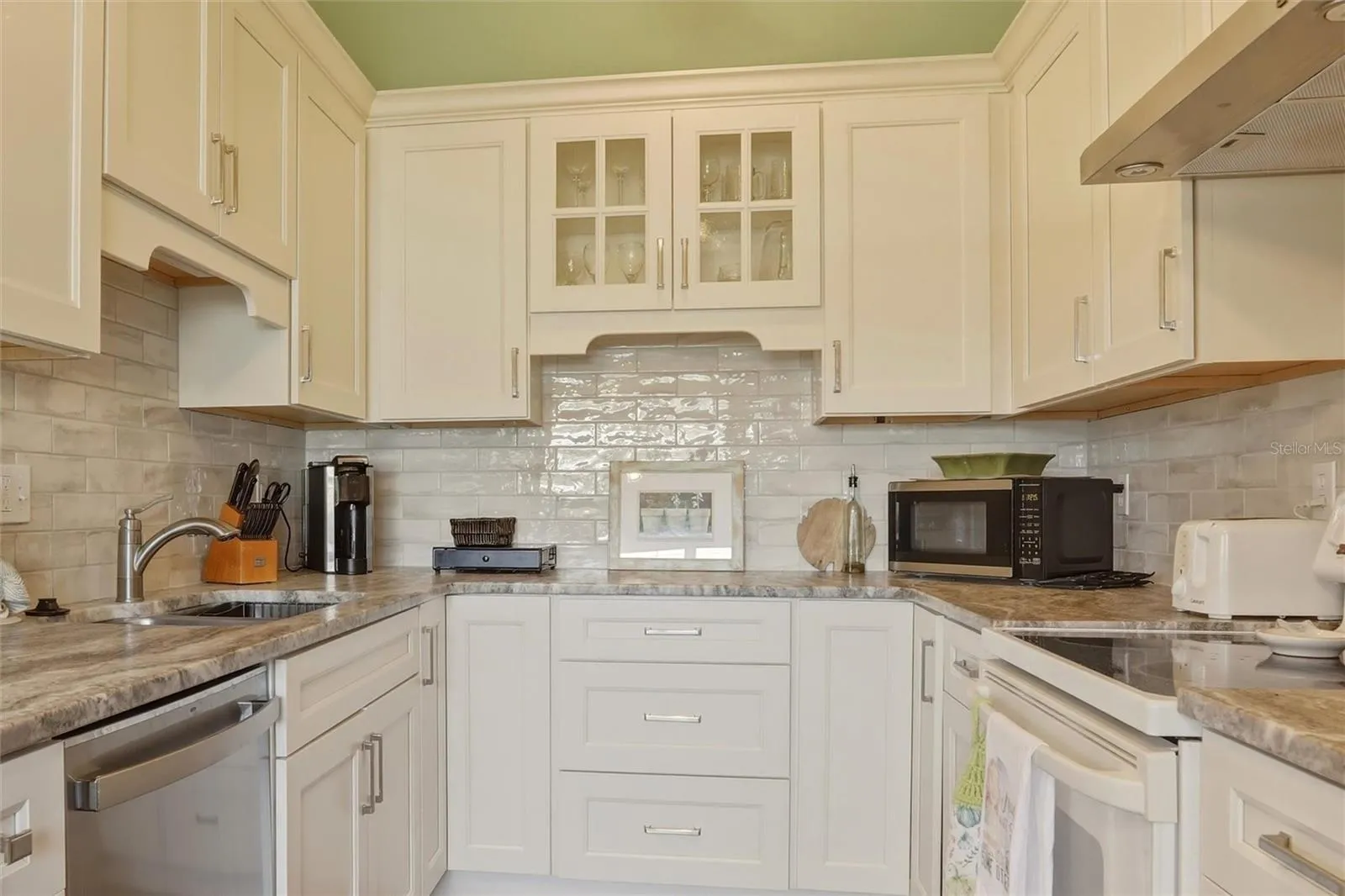 The recently renovated kitchen is a standout, showcasing crisp white cabinetry, elegant, brushed marble countertops, a glass tile backsplash, and stainless-steel appliances. Throughout the home, you’ll find ceiling fans and updated lighting fixtures that enhance the coastal charm.
