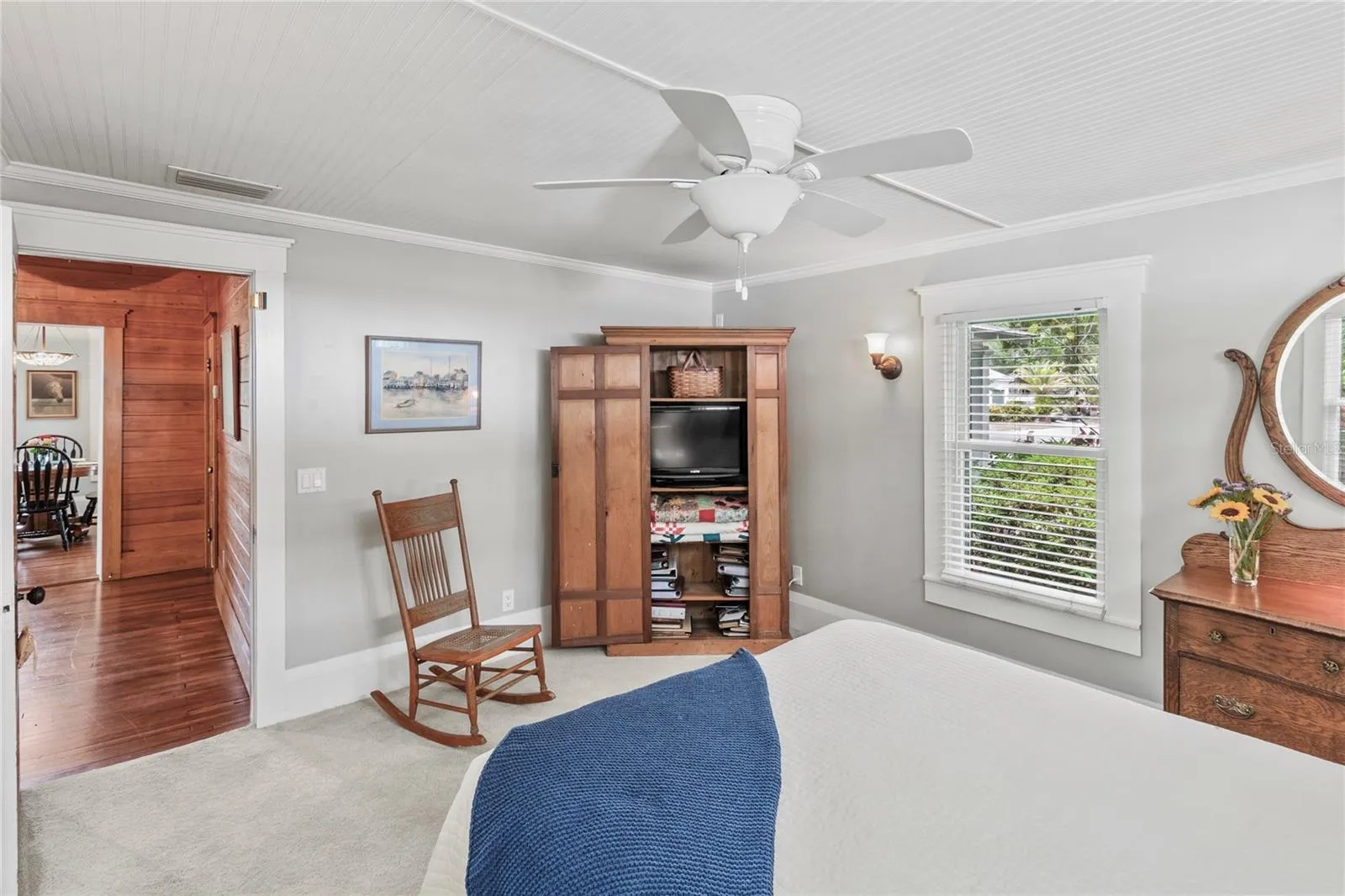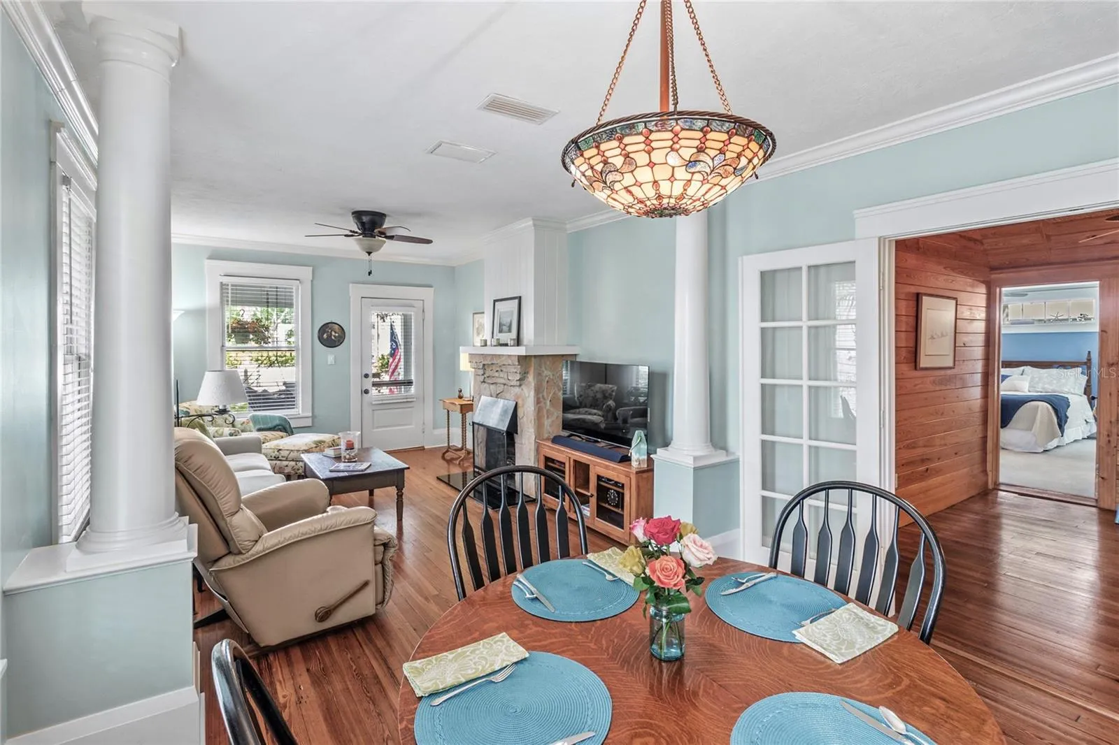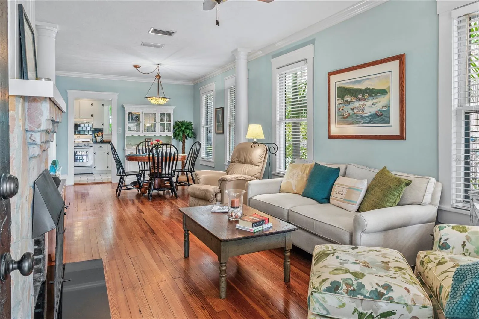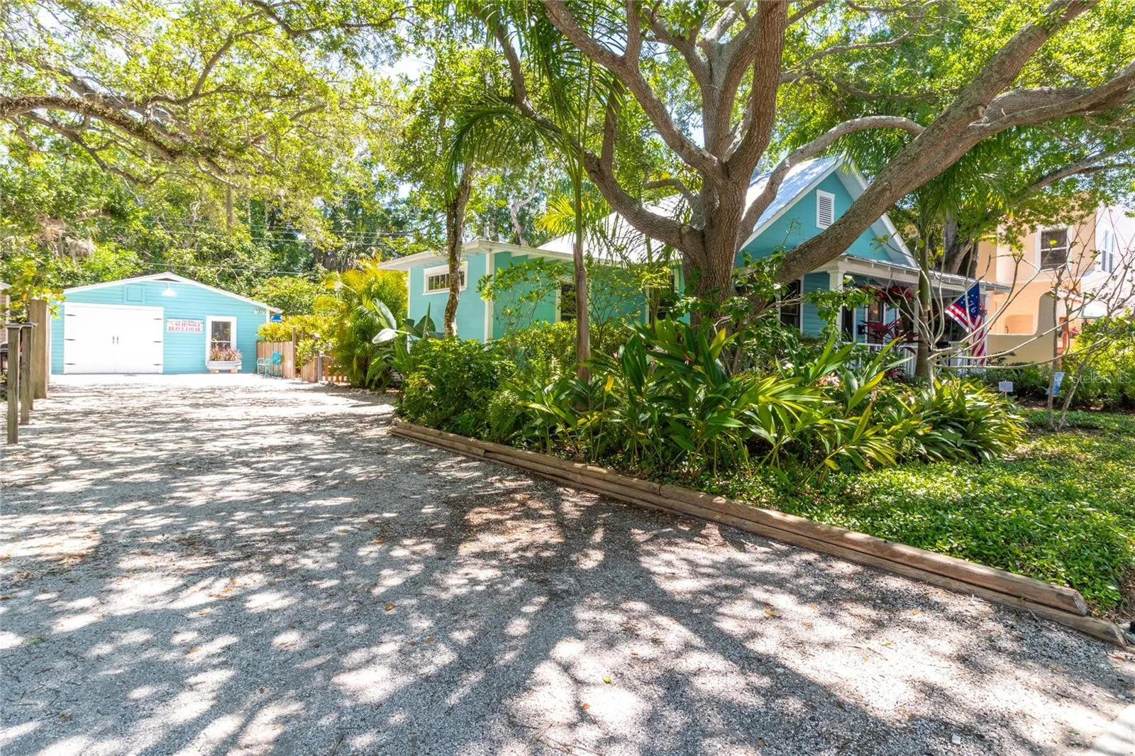 Restored 1922 Key West-style bungalow in the heart of Bradenton’s historic River District – the perfect walking or biking location to the Manatee River, downtown events, parks, boat launches, shopping, dining, and just a few miles to Gulf beaches! This beautiful home has had many substantial upgrades, including a new roof and a restored fireplace. Its high ceilings, light cascading from its many original windows, heart pine floors, extensive woodwork, and HGTV’s coastal colors give you a feeling of calm serenity as you enter. The large front porch and backyard with its brick patio are wonderful spaces to relax, grill out, or entertain. An outdoor shower, sprinkler system, and landscape lighting further enhance this spacious, fenced, and private paradise, along with centennial oaks and tropical plantings. Storage space includes a walk-in master closet, separate utility and pantry rooms, and a spacious stand-up attic. A wood-paneled flex room in the center of the home allows for a home office, playroom, or studio. This cook’s kitchen is a joy with its beautiful windows, cast iron sink, and vintage-look appliances. The detached garage with hot/cold running water may meet other needs, such as a family apartment, rental unit, or office. The wide driveway allows for boat/RV parking, with electric and water hookups, while still having room for multiple vehicles. When it’s time to leave, I-75, Sarasota, and Tampa airports are nearby. Come fall in love with this Olde Florida home! Note: Price includes most furnishings.