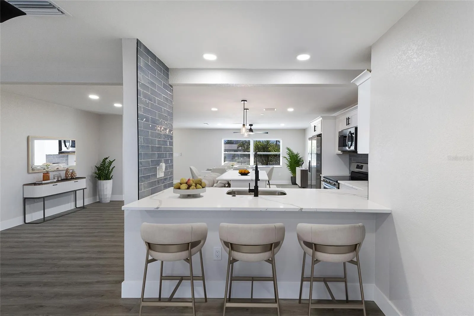 Only 5 photos (living room dining room area) have been virtually staged. WELCOME to a boaters dream, do not miss out on this fabulous waterfront home. This is luxury waterfront living, just minutes by land or water to the sugar-sand beach’s and local coastal dining on Anna Maria Island. Flamingo Cay is a very convenient and lovely waterfront neighborhood positioned right between the island and the mainland, allowing for great access to all that west Bradenton also has to offer including dining , shopping , parks and recreation, golf courses, movie theater’s, museums, and much more. This exceptional 3 bedroom 3 bath pool home offers you a completely updated new kitchen, featuring new cabinets, new fixtures, new quartz counter tops, all new appliances, and new flooring. It is hard not to notice the wonderful open floor plan, where the kitchen is in the middle and is perfect for entertaining featuring one large island and a breakfast bar great for food and beverage set up . In addition to the new interior spaces, there is a new roof, new AC , hot water tank, pool pump, and all new fresh paint inside and outside. The primary bedroom also has a large bonus room. This space is large enough for an office, nursery or media room, currently being used as a second extra large walk in closet. It is also large enough to add an island in the middle for more storage, or clothing and a folding area. The home also has a second en-suite bedroom bath convenient with its own exit to the pool and backyard patio perfect for when you have overnight guests. Plenty of parking out front with the circular drive and the 2-car garage provides plenty of space and storage. The backyard offers over 90 feet of water frontage with a brand new seawall and direct access to the inter-coastal where you can experience beautiful sunsets or dining at one of the many waterfront restaurants in just minutes. As far as this lovely home goes, there really is absolutely nothing to do but to bring your boat and start living your best Florida life. Do not let this one slip away or miss out on your opportunity to live on the water.