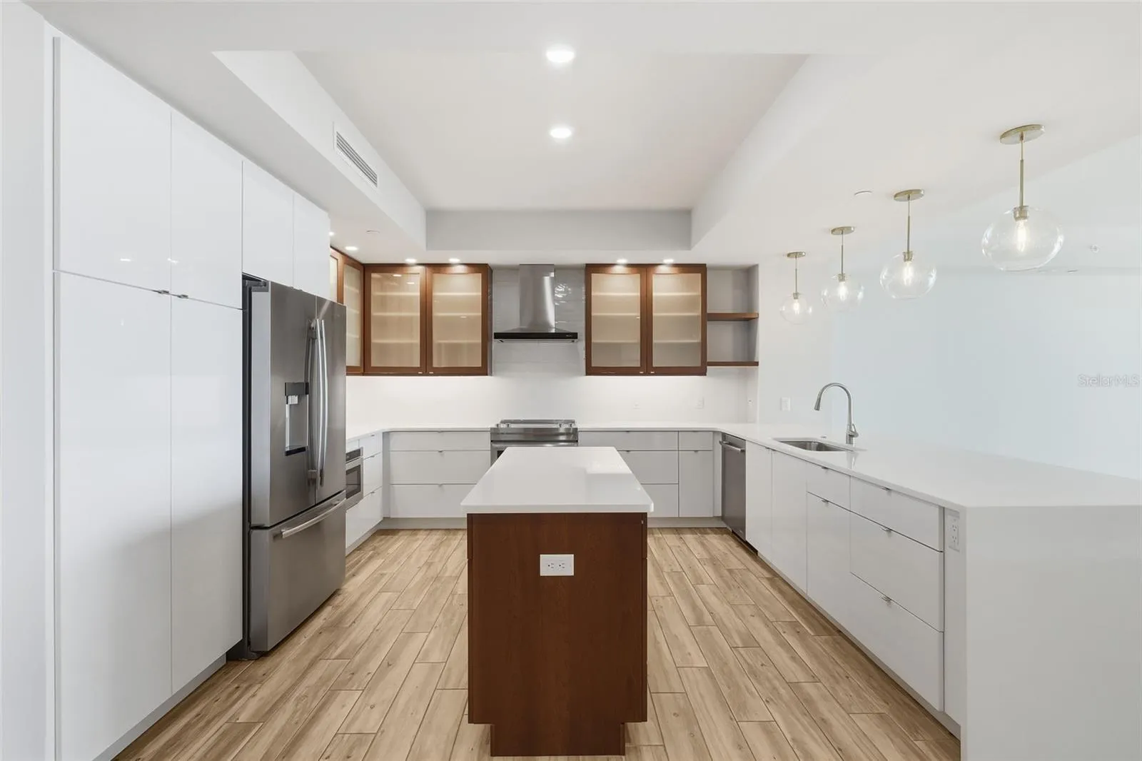 Step inside to an expansive open-concept living space featuring floor-to-ceiling impact glass, soaring ceilings, and seamless indoor-outdoor flow to an oversized covered terrace overlooking the Gulf, Shell Key Preserve, and nightly sunsets. The gourmet chef’s kitchen is equipped with top-of-the-line appliances, a large center island, custom cabinetry, and designer finishes—perfect for entertaining. Home has Pelican whole house water filtration system, electric fireplace, leak detection system and electric hurricane shutters.