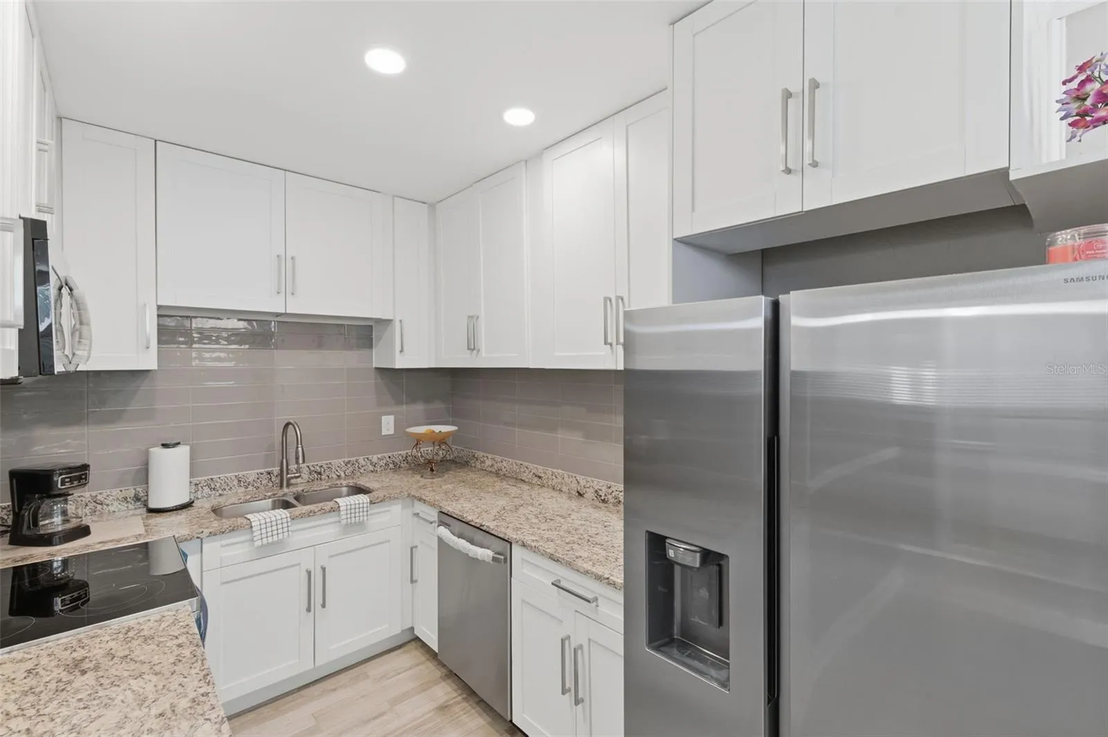 The beautifully updated kitchen features white cabinetry, granite countertops, attractive flooring, and brand-new Samsung fingerprint-resistant stainless steel appliances, including refrigerator, stove, dishwasher, and microwave—all backed by a FACTORY WARRANTY for added peace of mind.