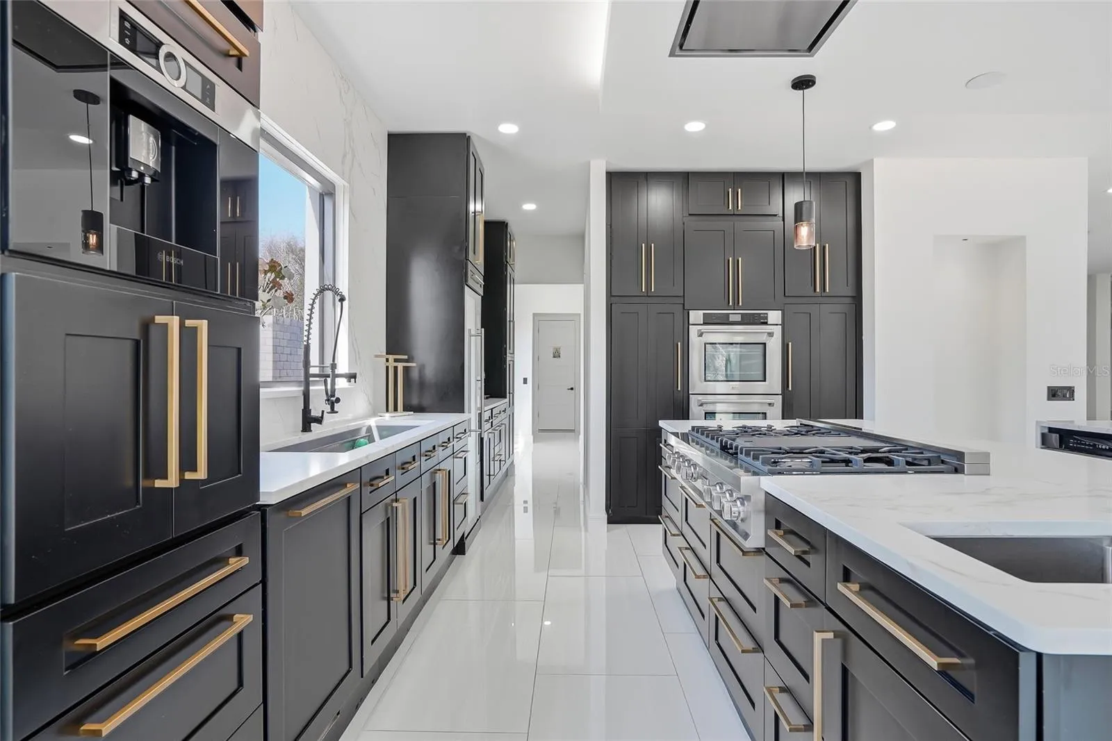 At the heart of the home lies a gourmet kitchen crafted to satisfy even the most discerning culinary enthusiast. Outfitted with premium-grade appliances, it includes a professional six-burner gas range, double ovens, paneled refrigerator and freezer, integrated automatic coffee system, and a grand central island that balances aesthetic presence with everyday functionality. This kitchen is as much a showpiece as it is a working culinary space, ideal for both casual family meals and entertaining.