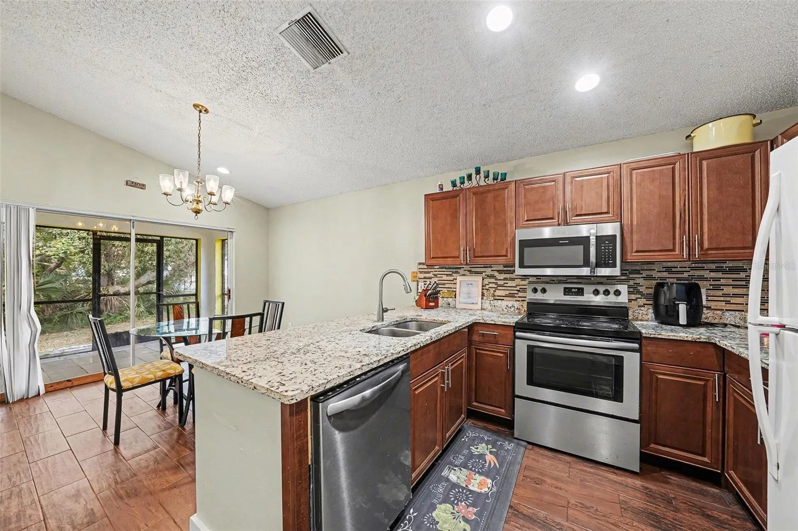 Step outside to the screened lanai and enjoy your own private retreat, surrounded by mature trees that provide both privacy and tranquility — the perfect setting for morning coffee or unwinding at the end of the day.