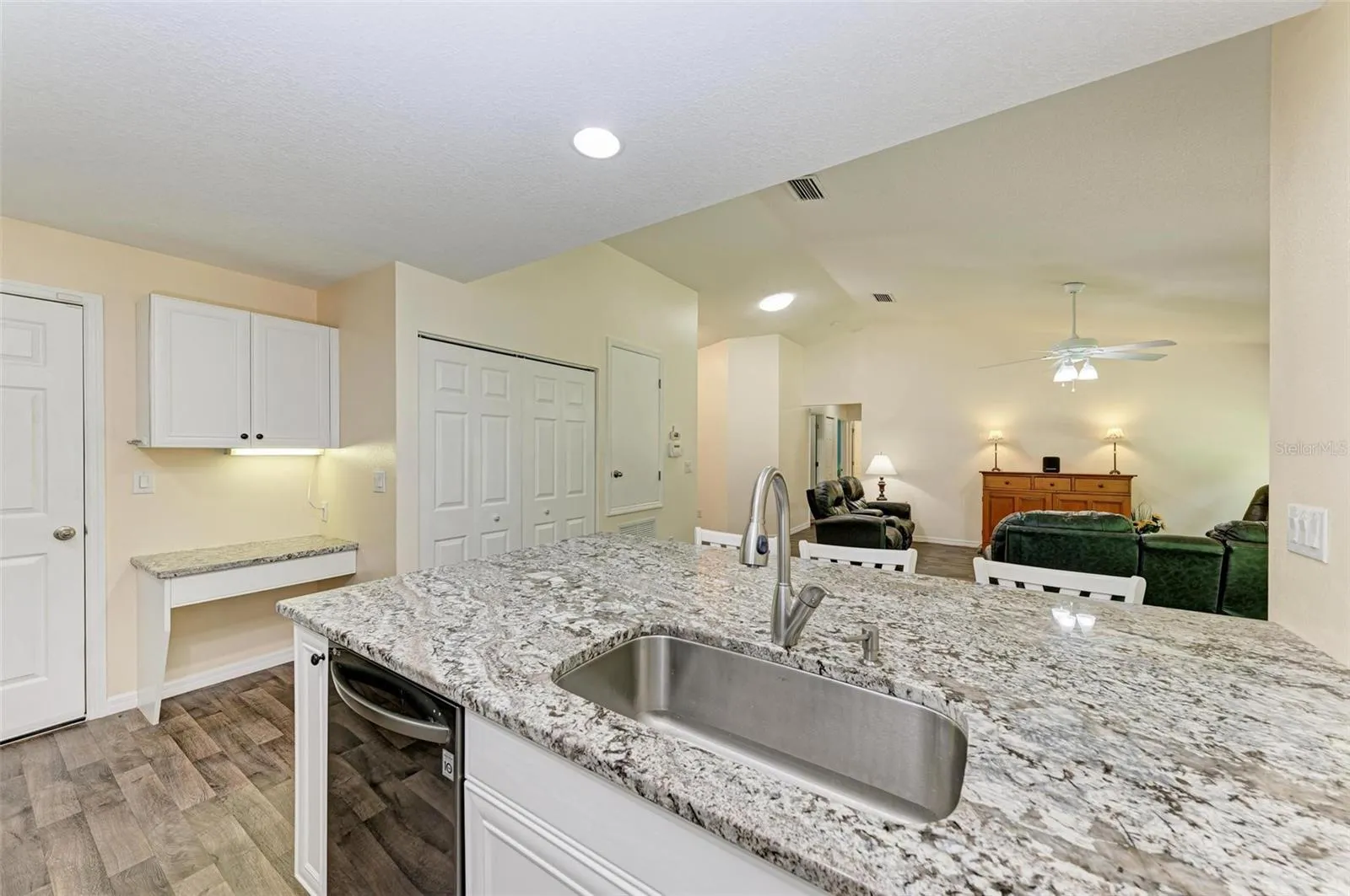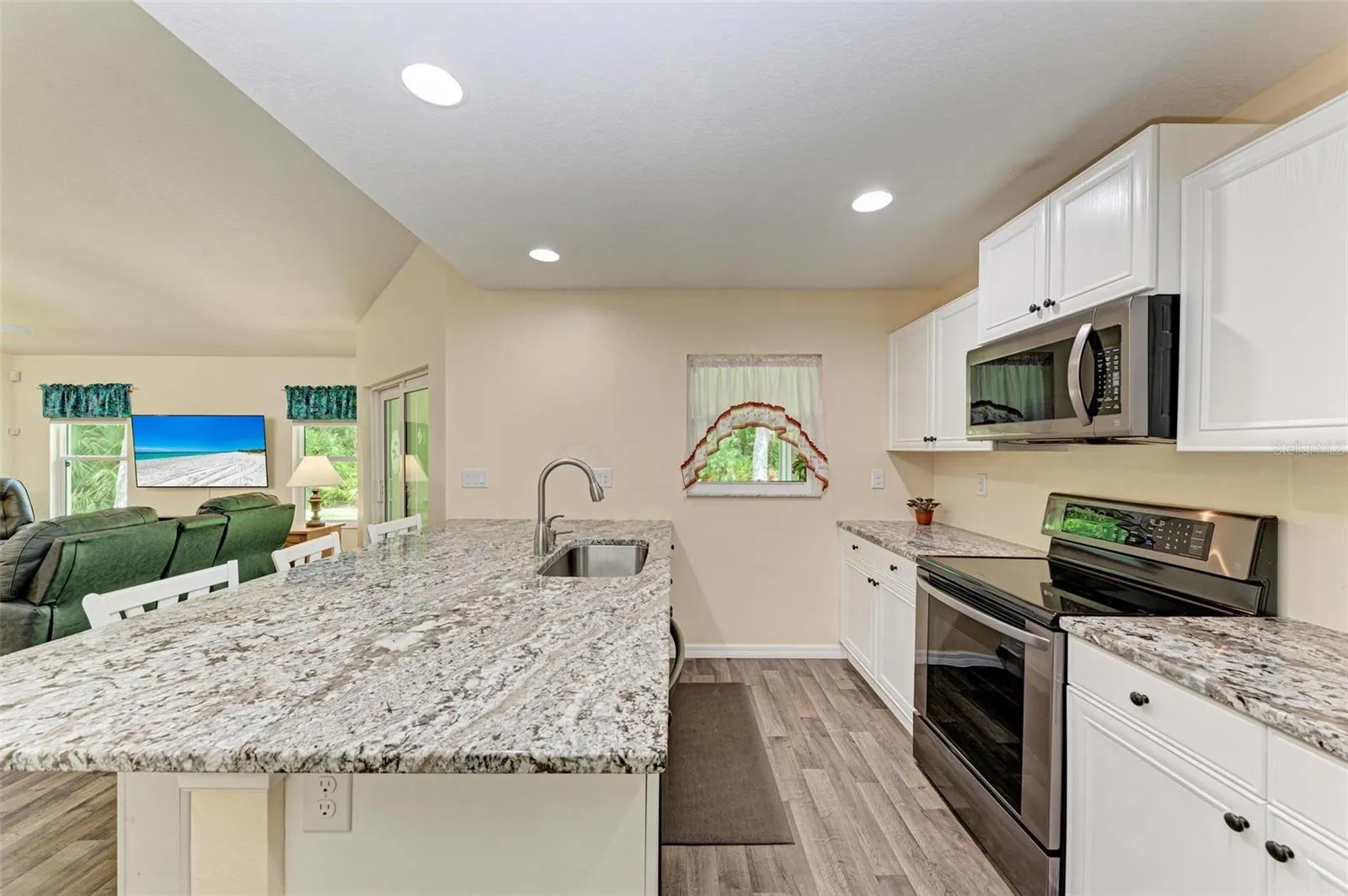 - Ceiling Fans(s), Open Floorplan, Thermostat, Walk-In Closet(s), Kitchen/Family Room Combo, Primary Bedroom Main Floor, Window Treatments, High Ceilings, Vaulted Ceiling(s), Stone Counters, Solid Wood Cabinets