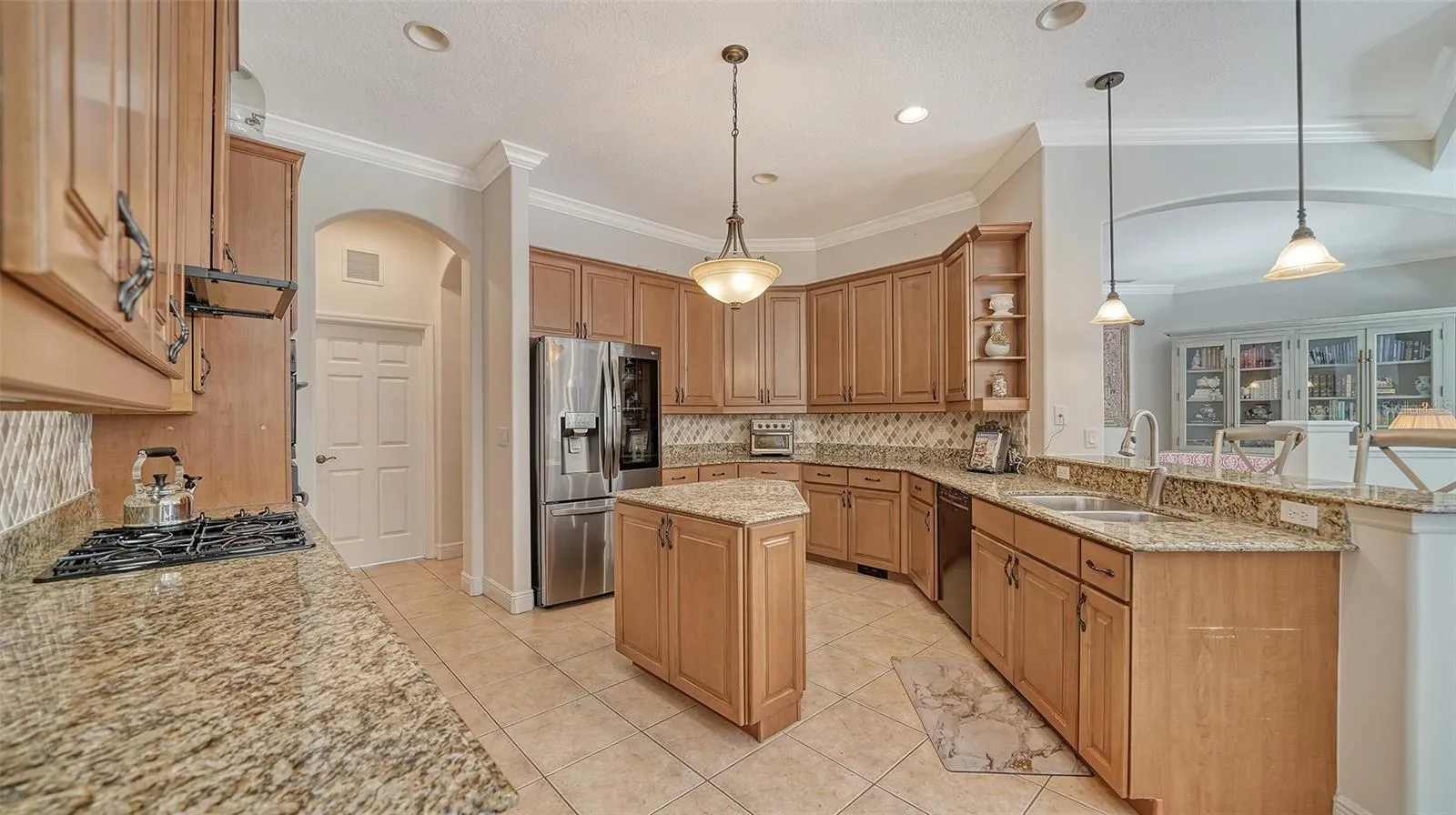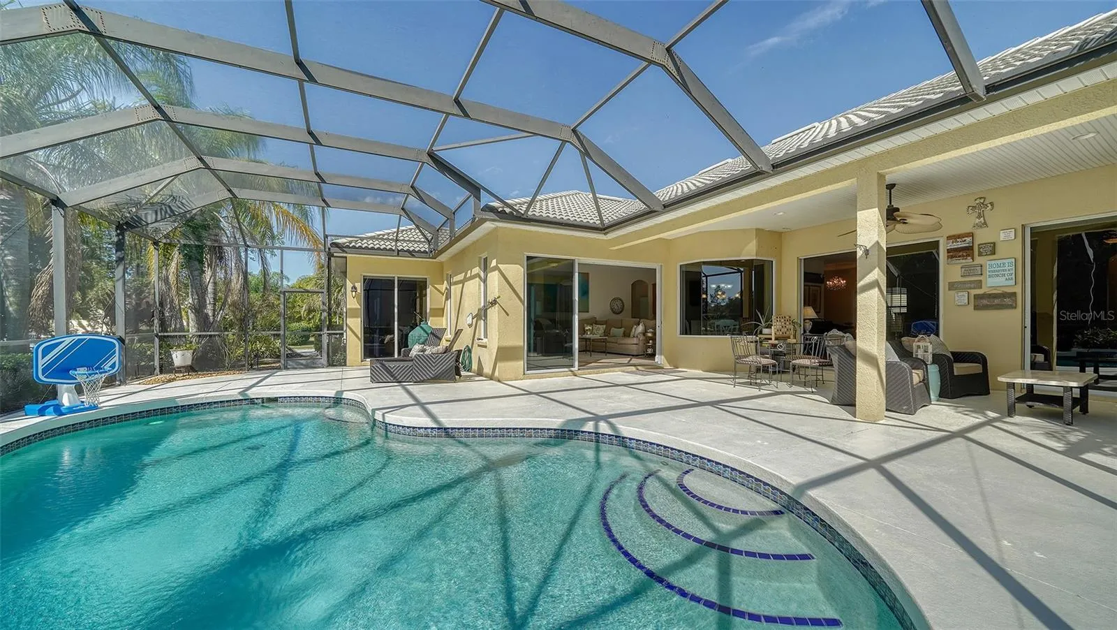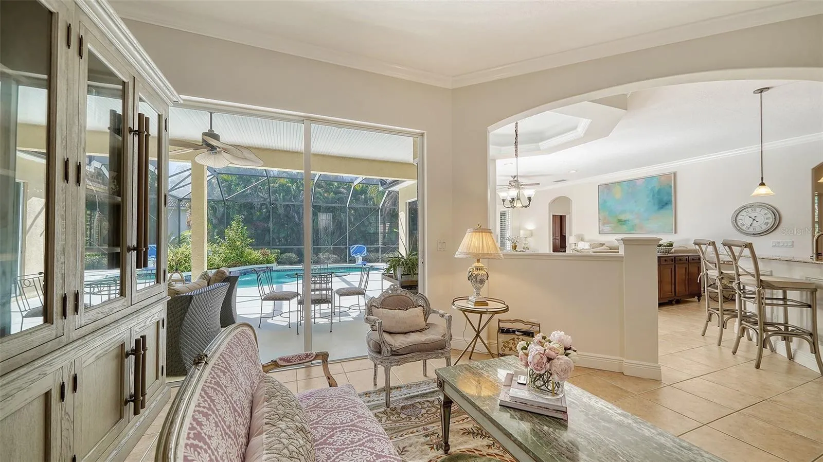 Discover unparalleled comfort and convenient living within Lakewood Ranch’s esteemed Greenbrook Preserve. This charming 3-bedroom home, complemented by a flexible den that easily converts into a 4th bedroom, features 3 full bathrooms, embodying contemporary convenience. When entering this home, a paver driveway and walkway and a cozy front porch welcomes you, setting the tone for the warmth of this home. Inside, experience a seamless blend of functionality and elegance. Entertain guests in the dining room or unwind in the inviting sitting area, all while others can enjoy the spacious great room. The kitchen, designed for both style and practicality, boasts granite countertops, a built-in oven, natural gas cooktop, decorative backsplash, ample counter space, a prep island, pantry, and a breakfast bar for casual dining. Retreat to the owner’s suite, featuring a generous sitting area ideal for a home office or personal relaxation space. The ensuite bathroom offers a double sink vanity, a soothing garden tub, a walk-in shower, and a spacious walk-in closet. Bedrooms 2 and 3 exude comfort with luxury vinyl flooring, while the adjacent bathroom boasts dual sinks and sizable vanity. The home office impresses with its wood floors, extensive built-in desk and cabinets, and convenient access to the pool area. Step outside to the expansive pool area, where a saltwater pool with fountain awaits, providing the perfect setting for outdoor relaxation and entertainment. Recent upgrades include fresh interior paint in 2024, a new pool pump and saltwater system added in 2023, and a water softener with updated bathroom fixtures in 2022. Tray ceilings, crown molding, and plantation shutters add to the comfort and charm of this inviting home. Situated in the desirable Greenbrook neighborhood, enjoy proximity to McNeal Elementary School, Nolan Middle School, Greenbrook Park and a variety of dining and shopping options at UTC, Waterside and Lakewood Ranch Main Street. Schedule your viewing today and embrace the opportunity to experience the comfort and convenience of this exceptional home in Lakewood Ranch.