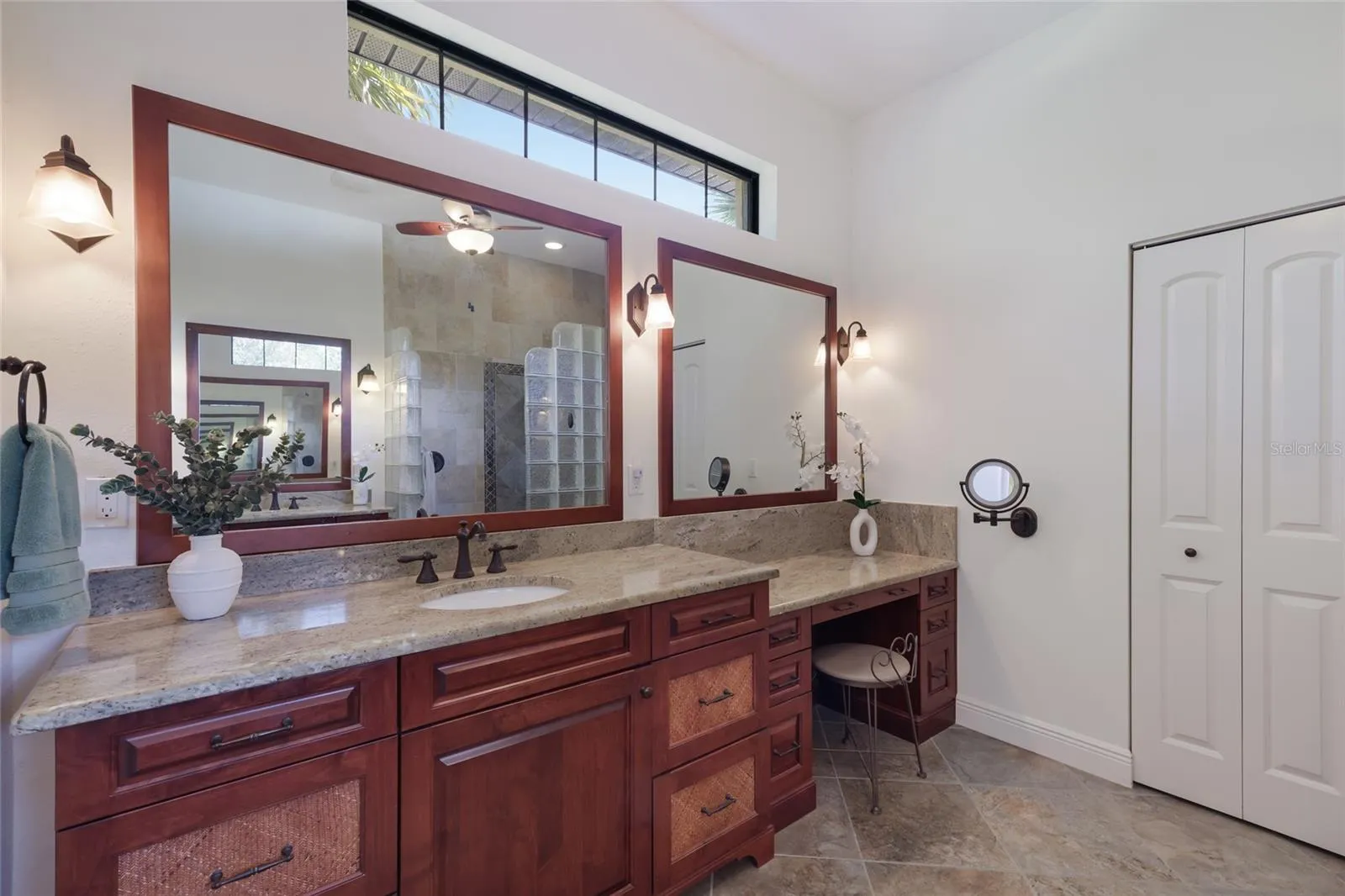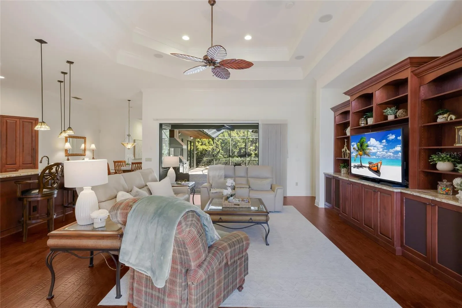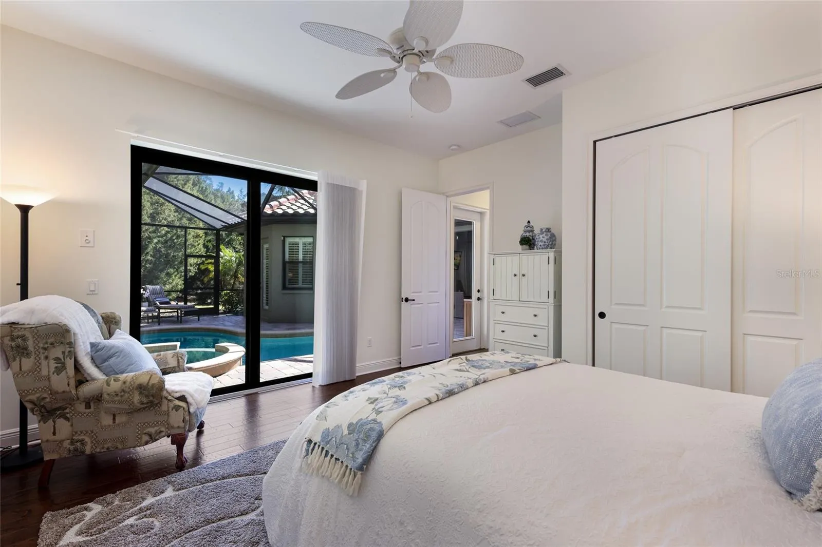 Set on nearly a half acre at the end of a quiet cul-de-sac with no homes on one side, this custom residence in a maintenance free neighborhood in Country Club East offers privacy, quality craftsmanship, and refined comfort throughout. Built with hurricane-impact windows and doors, the home features three bedrooms plus a private office complete with a walk-in storage closet. Rich wood flooring, plantation shutters, tray ceilings, crown moldings, architectural details and custom built-ins add warmth and character throughout. The kitchen serves as the true heart of this home, a Cook’s delight. It showcases double built-in Viking wall ovens, a 6 burner Viking gas cooktop, built-in Viking microwave and warming drawer. The center island has its own prep sink with a breakfast bar that also provides seating to converse with the cook. The walk in pantry provides extensive storage as well as an appliance counter and drawers for baking supplies. The dinette is framed by an aquarium window. The primary suite is a peaceful retreat with a tray ceiling, double glass doors opening to the lanai, two custom-organized walk-in closets, and a spacious en suite bath featuring dual vanities, a walk-in shower, private water closet, and linen closet. One guest bedroom includes a built-in Murphy bed and an en suite bath, while the second guest room offers pocket slider access to the pool and lanai. Outdoor living is equally impressive with a private pool, spa, and fully equipped outdoor kitchen, creating seamless indoor-outdoor enjoyment. The home also offers a three-car garage and an exquisite laundry room with a utility sink, marble counters and beautiful cabinetry. Secret Harbor is an exclusive enclave within Country Club East offering maintenance-free living. Residents of Country Club East enjoy access to The Retreat fitness center and resort-style pool, and the Lakewood Ranch Golf & Country Club offers several levels of optional membership.