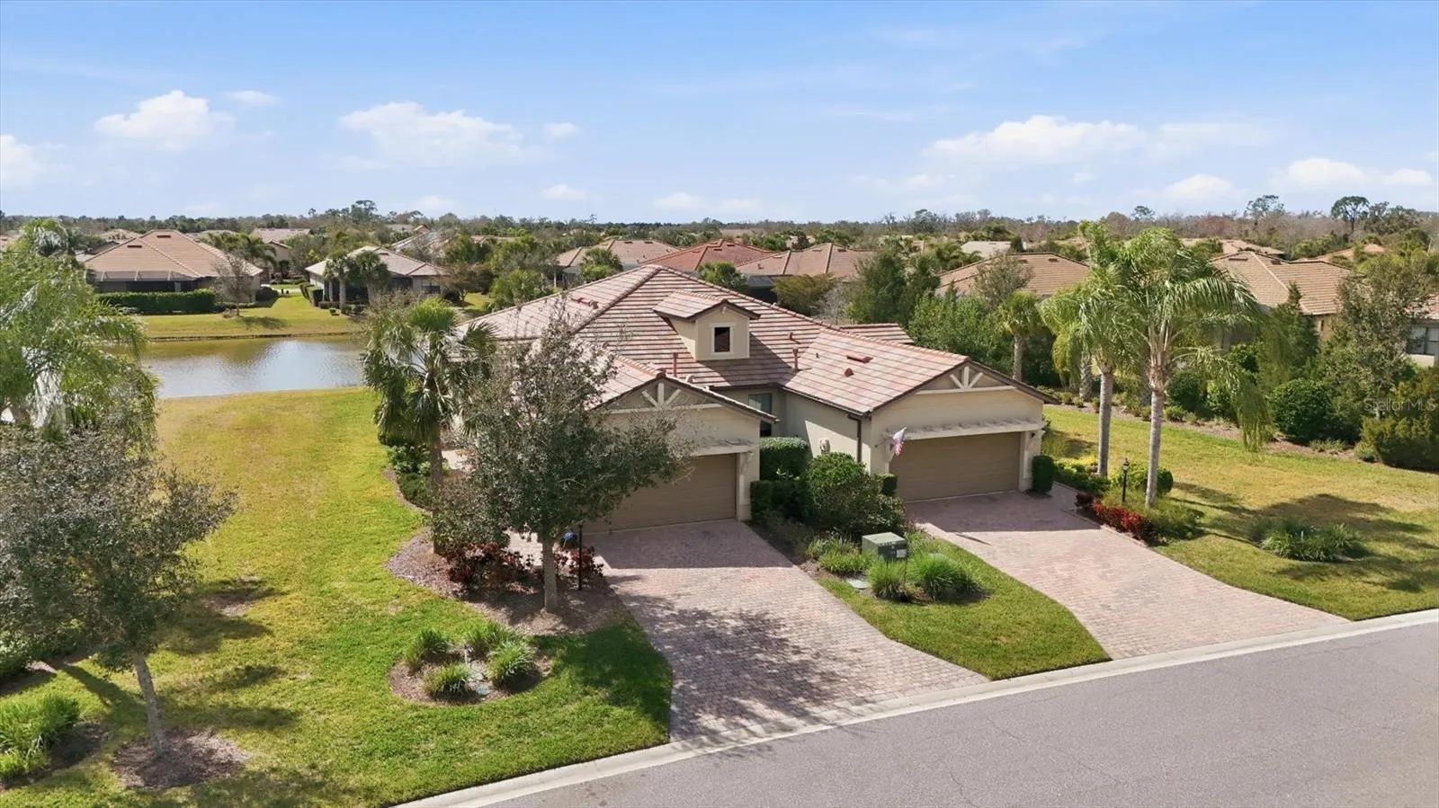 Wake up to water views in this beautiful paired villa in Del Webb at Lakewood Ranch. Enjoy the convenient access at the end of the cul-de-sac to the path leading directly to the clubhouse and resort-style amenities. Offered furnished, this residence is well maintained and has 2 bedrooms plus a spacious office adding flexibility for a 3rd bedroom. Designed with an open-concept layout, the main living areas feature ceramic tile flooring and flow seamlessly toward the water. The kitchen has granite counters, a bar and a pantry. The primary bedroom has water views and an en-suite bathroom with dual sinks, shower, walk-in and linen closets, and a water closet. The second bedroom has a large walk-in closet and is adjacent to the second bathroom. The inside laundry room has plenty of storage and hosts a utility sink. Enjoy quiet mornings on the cozy screened lanai overlooking the water before heading out to enjoy your new lifestyle in the premier 55+ pet friendly community of Del Webb. The amenities include an abundance of social activities, pools, a restaurant, live music, tennis, pickleball, bocce ball, fitness center, and an impressive array of amenities designed for active living. Take advantage of peaceful common area walking trails set along scenic ponds and enjoy the ease of a golf cart friendly community. Endless opportunities to stay active and social, with everything you need to live well and stay engaged. Vibrant lifestyles just beyond your front door includes farmers markets, live music, boutique shopping, and waterfront dining. Easy access to I75, UTC Mall, Waterside, downtown Sarasota and Bradenton, Gulf Coast’s award-winning beaches and medical facilities. This is Lakewood Ranch living, done beautifully.