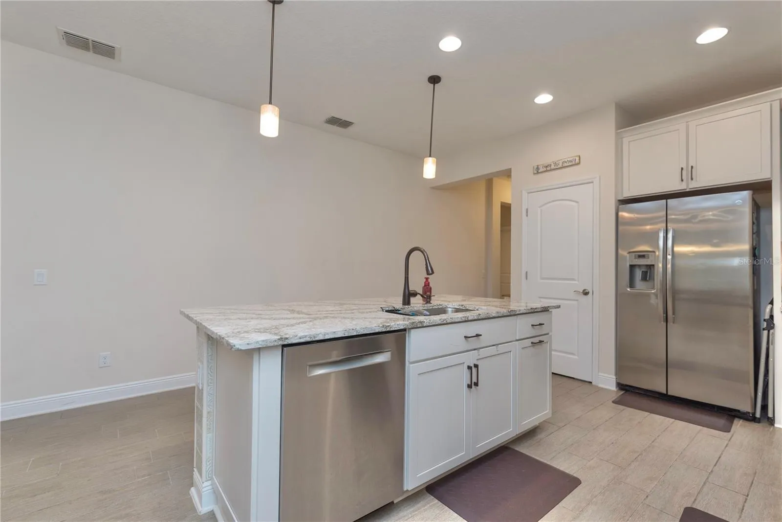 As you step inside, you’ll be greeted by an 8’ front door and stunning wood-like tile floors that flow through the living areas. The open-concept living room boasts a tray ceiling, creating a spacious and airy ambiance. Double doors lead to the flex room, providing flexibility to suit your lifestyle.