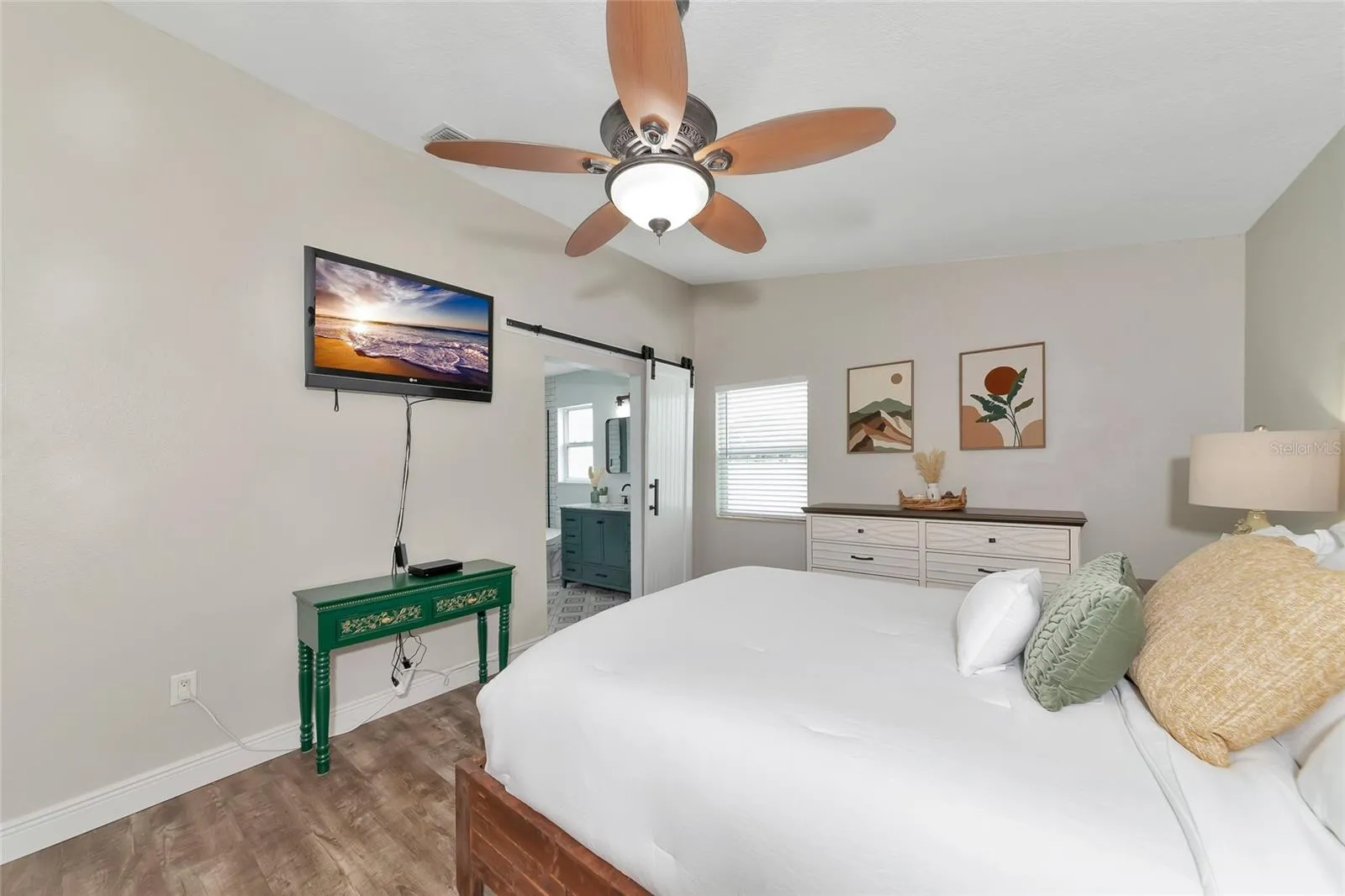 Abundant in natural light, creating a warm and inviting atmosphere this home is completely move-in ready! The luxury vinyl plank flooring extends throughout the entire home, offering a seamless and cohesive look. With a stone accent wall between the kitchen and the great room, the kitchen cabinets have been refinished for a modern update. Both bathrooms are completely updated. The guest bathroom stuns with a large standalone tub. The primary bath was completely remodeled in 2022 with brand new porcelain tile, shower with custom glass doors, new vanity, lighting, and custom “his and hers” medicine cabinets. The primary bedroom features a spacious walk-in closet, providing ample storage. Back bonus room provides endless possibilities, could be used as office, workout area, or play room. Embrace the Florida lifestyle with lush landscaping on a corner lot with both front and back lanais, perfect for relaxing and entertaining. The backyard, enclosed by a white vinyl fence installed in 2020, offers privacy and a clean, modern look.
