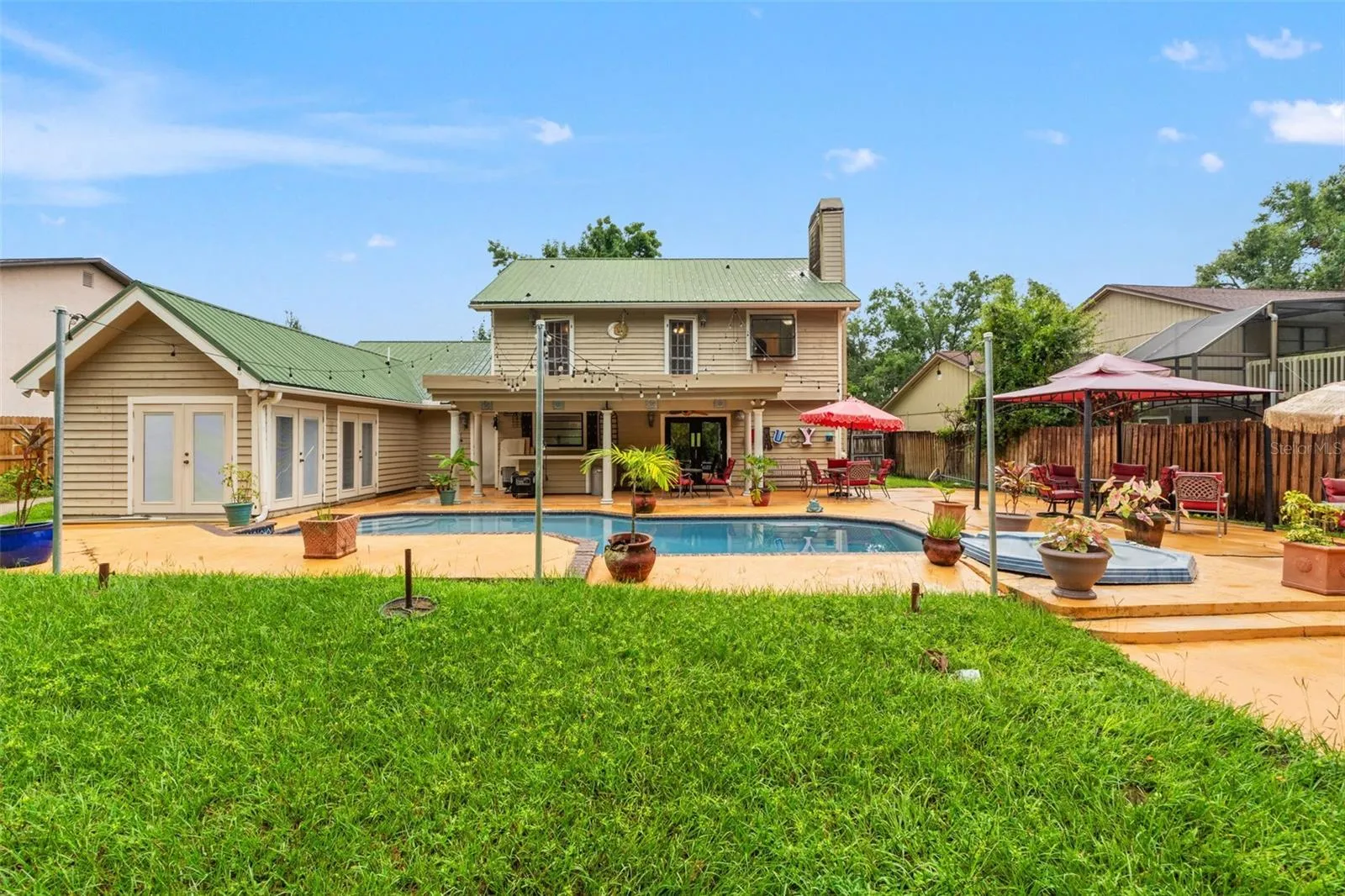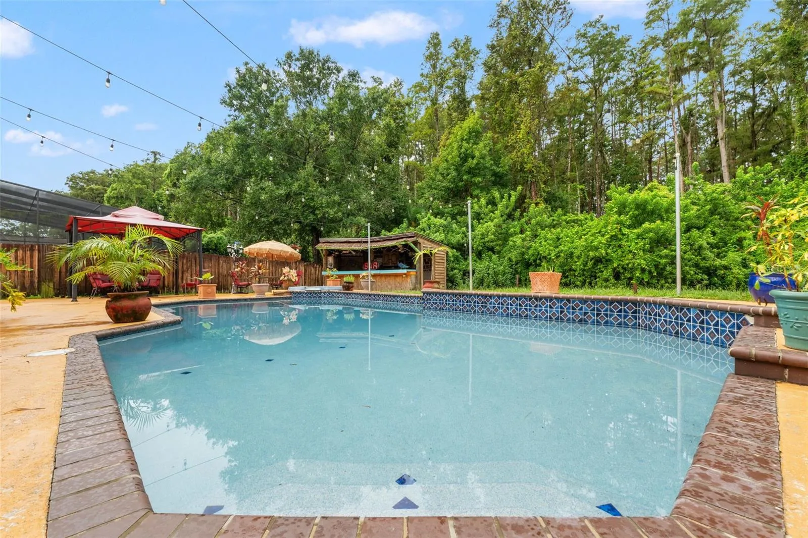 fenced backyard provides privacy and room to roam. Entertain in style at the Tiki bar, fully