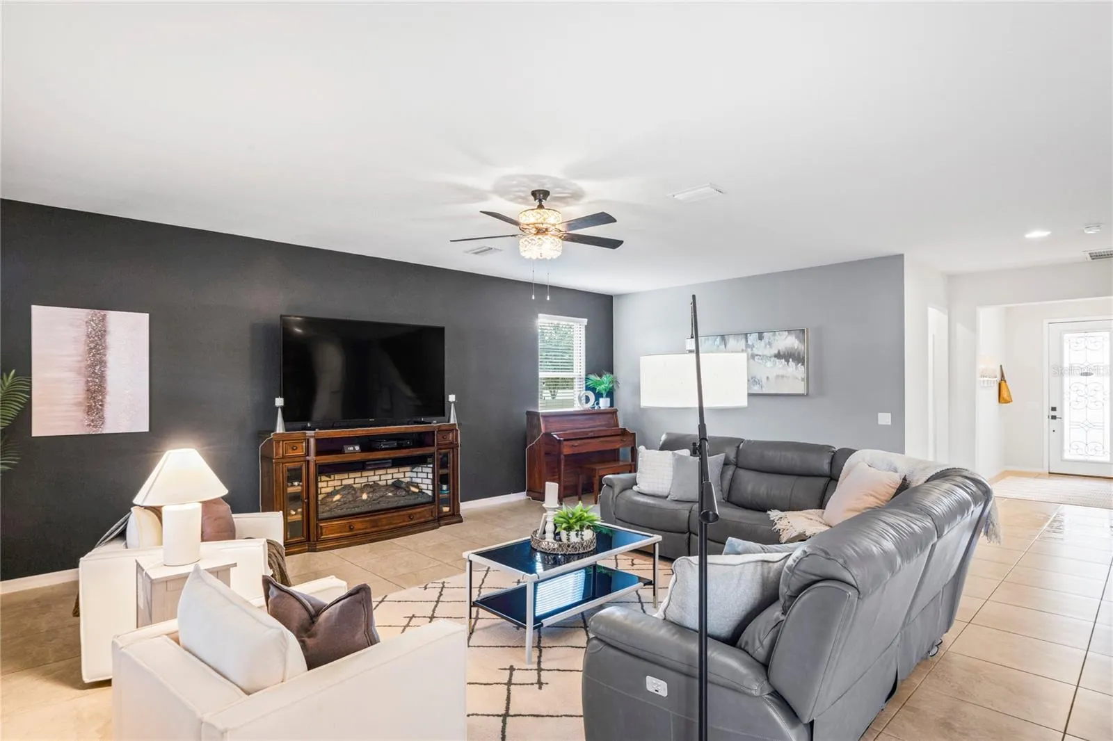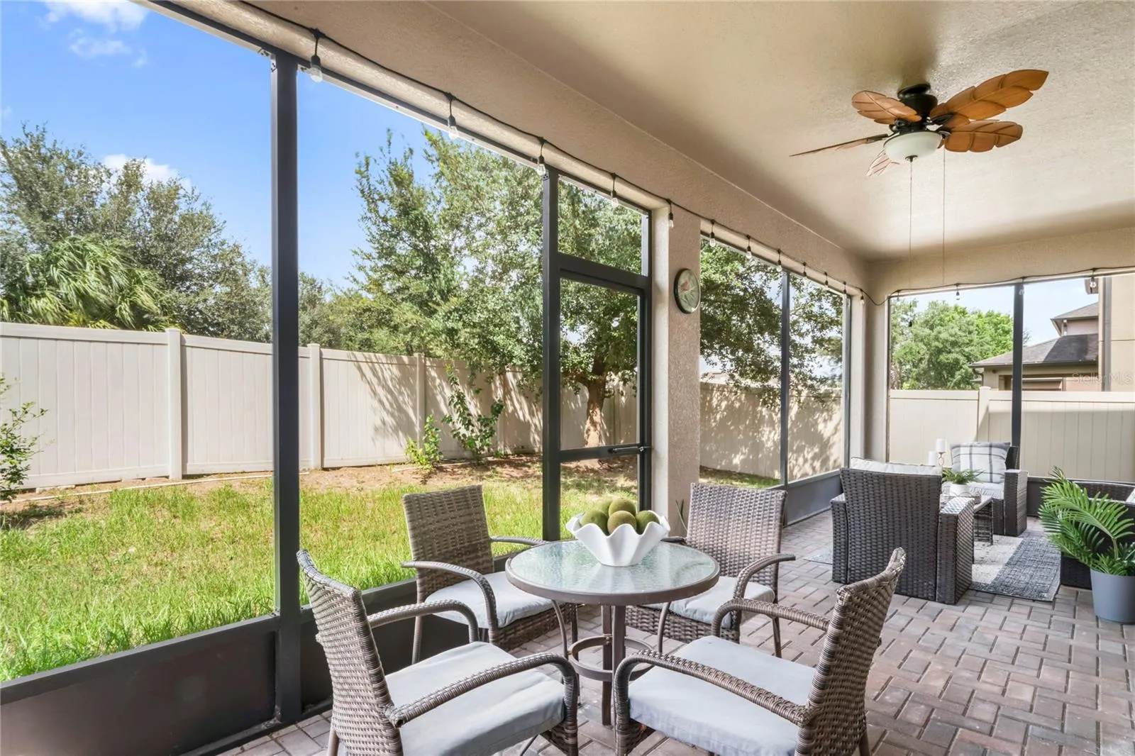 At the heart of the home, the chef’s kitchen is both striking and functional, showcasing stainless steel appliances, granite countertops, an oversized island, and a spacious walk-in pantry—perfect for everything from casual meals to entertaining on a larger scale. The open-concept living and dining areas flow seamlessly to a screened paver patio through expansive sliding glass doors, creating a true indoor-outdoor living experience.