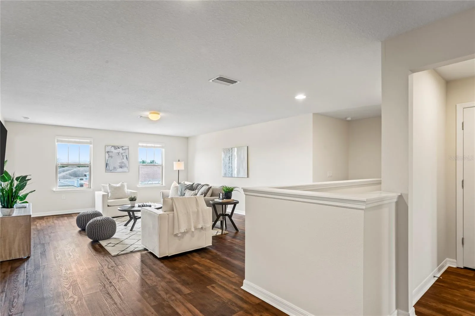 Upstairs, the primary suite serves as a private retreat, complete with a double split walk-in closet so each of you may have your own and a spa-inspired bathroom featuring a double vanity, expansive glass-enclosed shower, and ample storage. A generous loft-style family room connects the additional bedrooms, offering flexible space for a home office, media area, or relaxation.
