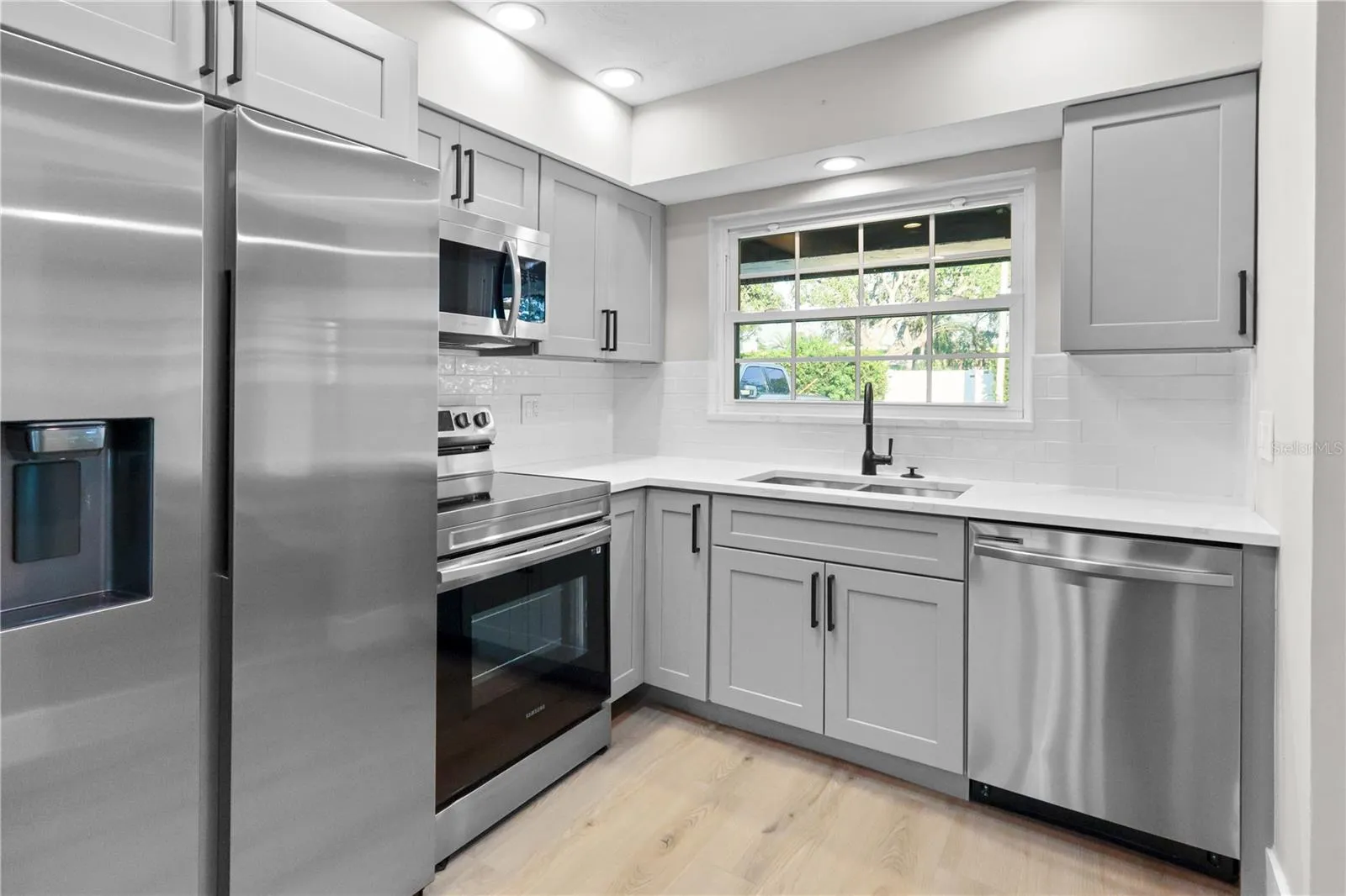 From the moment you enter, luxury vinyl plank flooring flows throughout the open-concept layout, enhanced by abundant natural light from all-new hurricane impact-rated windows and doors. The completely redesigned kitchen is a true showpiece, featuring river gray shaker cabinetry, quartz countertops, and brand-new stainless steel appliances. It seamlessly connects to the spacious dining and family areas, along with a versatile bonus room ideal for a home office, playroom, or flex space.