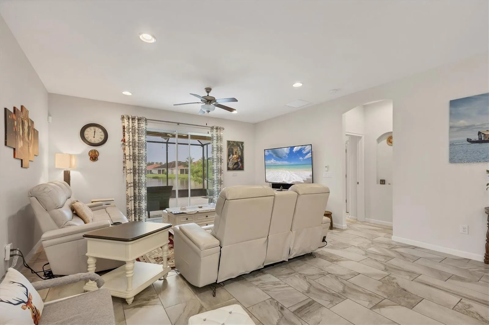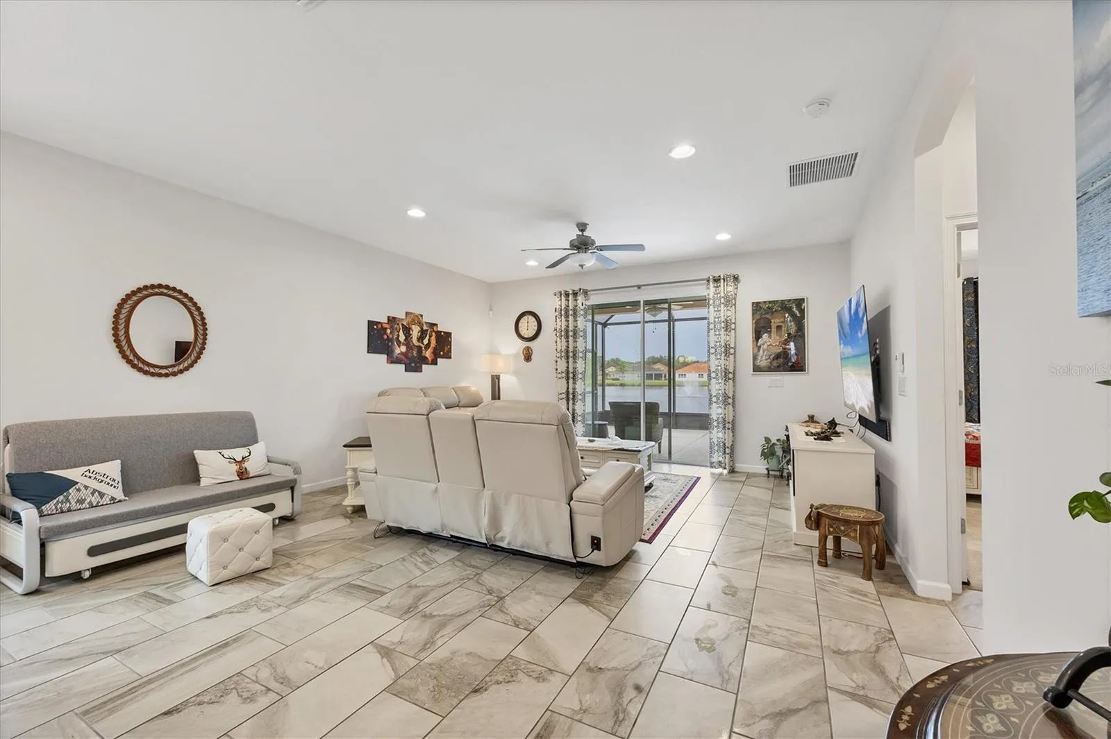 One of the secondary bedroom comes with a built-in Murphy bed, making it a versatile space that can effortlessly transition between a guest bedroom and a home office. For added comfort outdoors, the owner has installed a remote-controlled awning, allowing you to enjoy shade and relaxation at the touch of a button. The extended lanai overlooking a peaceful lake view offers the perfect setting to enjoy your morning coffee/tea or evening coffee/tea, soak in the serenity, or host gatherings in the beautiful Florida weather.