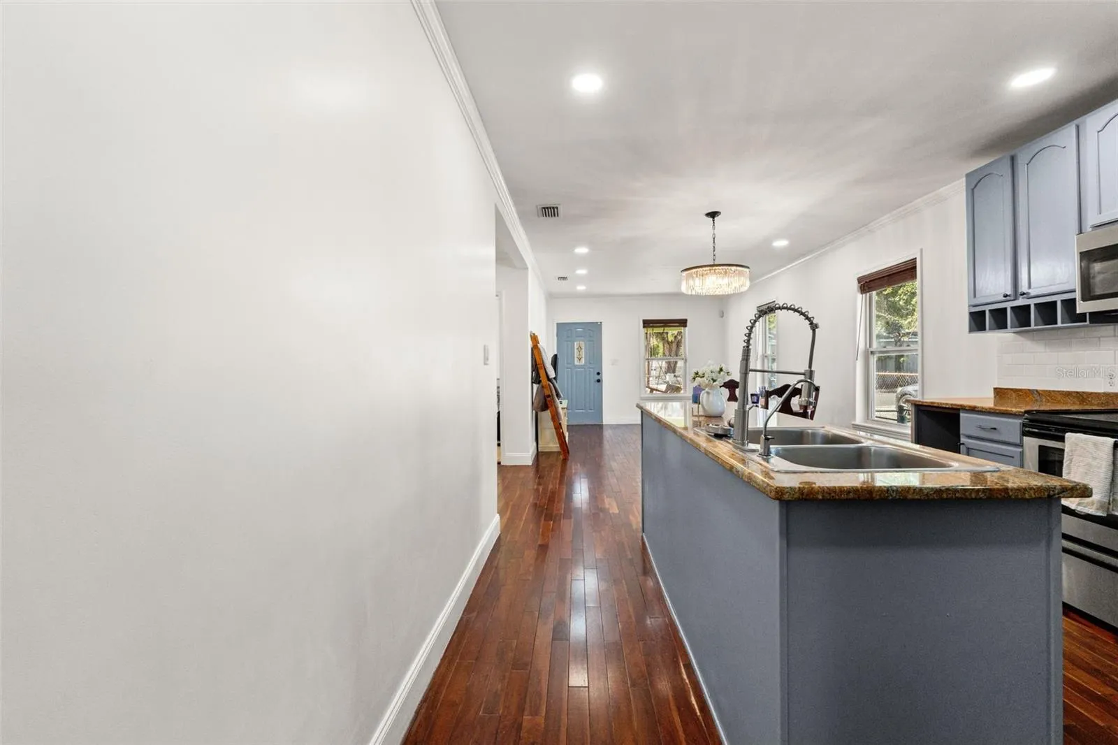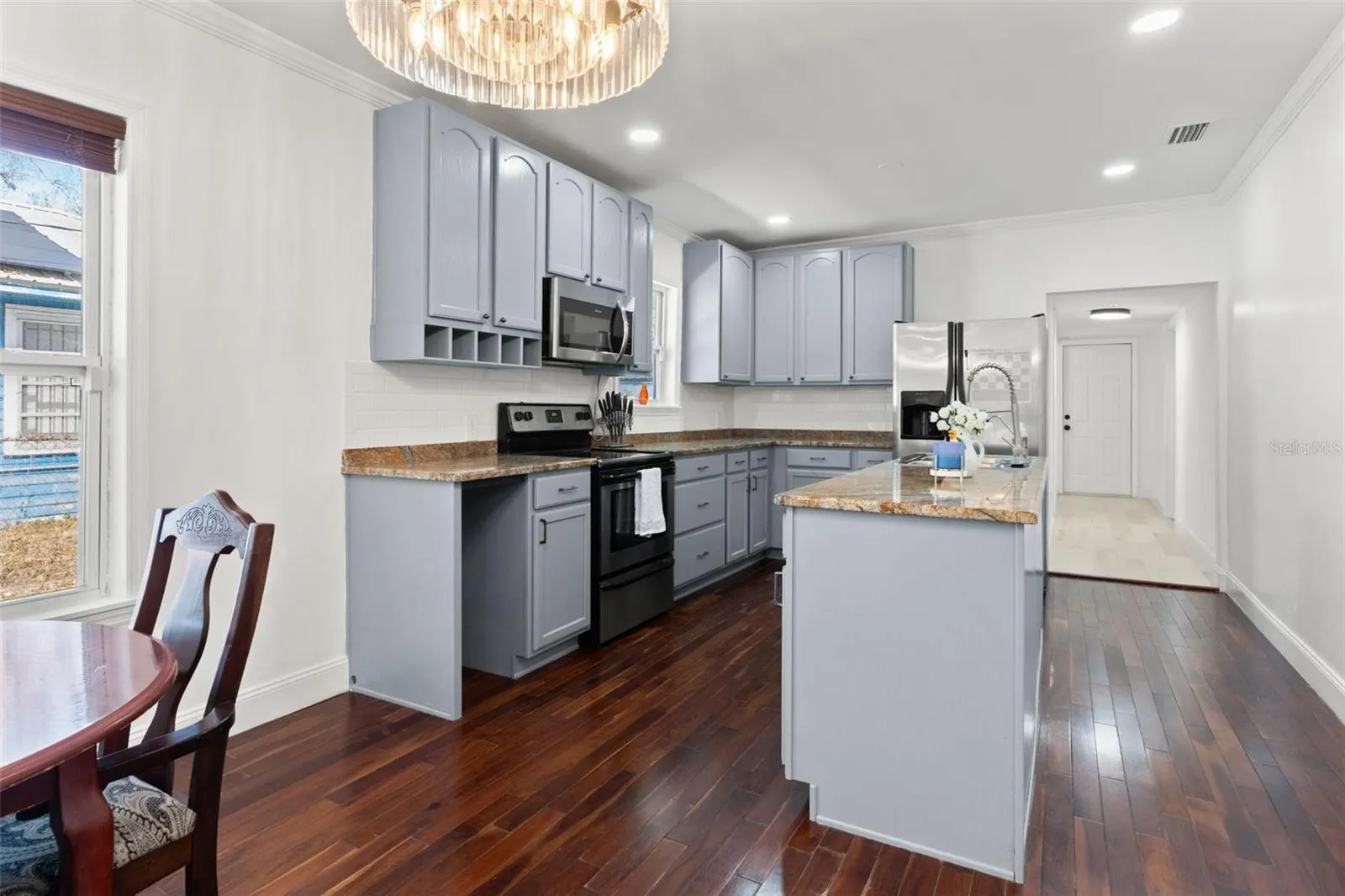 The renovated kitchen is truly the centerpiece, complete with granite countertops, soft-close cabinetry, upgraded hardware, and an oversized island ideal for entertaining or casual dining. Fresh cabinetry adds a crisp, modern touch while maintaining the home’s character.