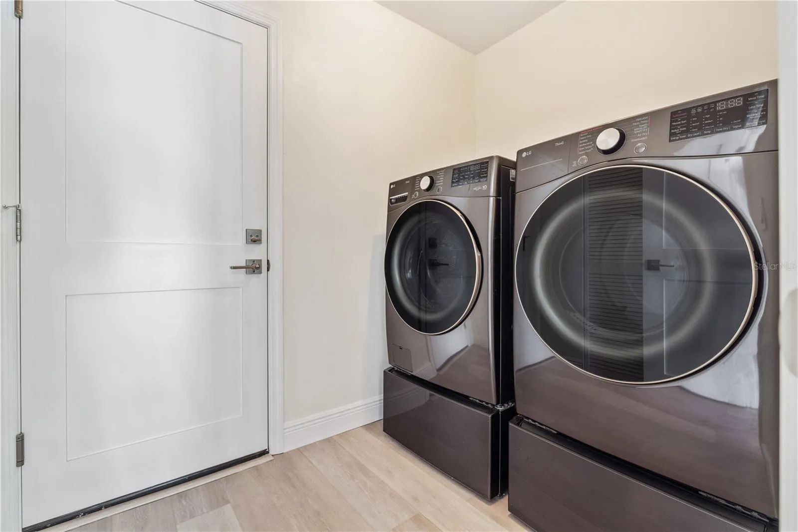 The primary suite is located furthest from the living spaces, offering maximum privacy and comfort. The primary bathroom features dual vanity, large shower, and a walk-in closet complete with a custom storage system. The guest suite features a private bathroom and direct access to the covered lanai through a side entry door. Brand new washer and dryer are located in the laundry room, which leads to the two-car garage.