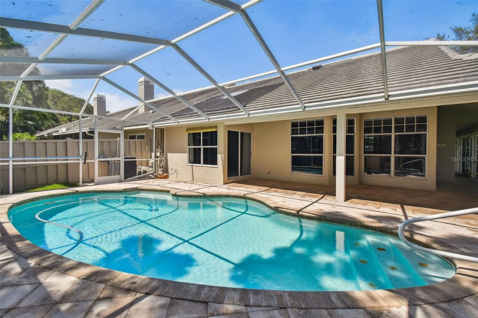 Outdoor Oasis: Relax in your private saltwater, solar-heated swimming pool with a heat pump. The huge wrap-around screened enclosed patio, built in outdoor kitchen with grill & sink and privacy-fenced yard are perfect for entertaining.