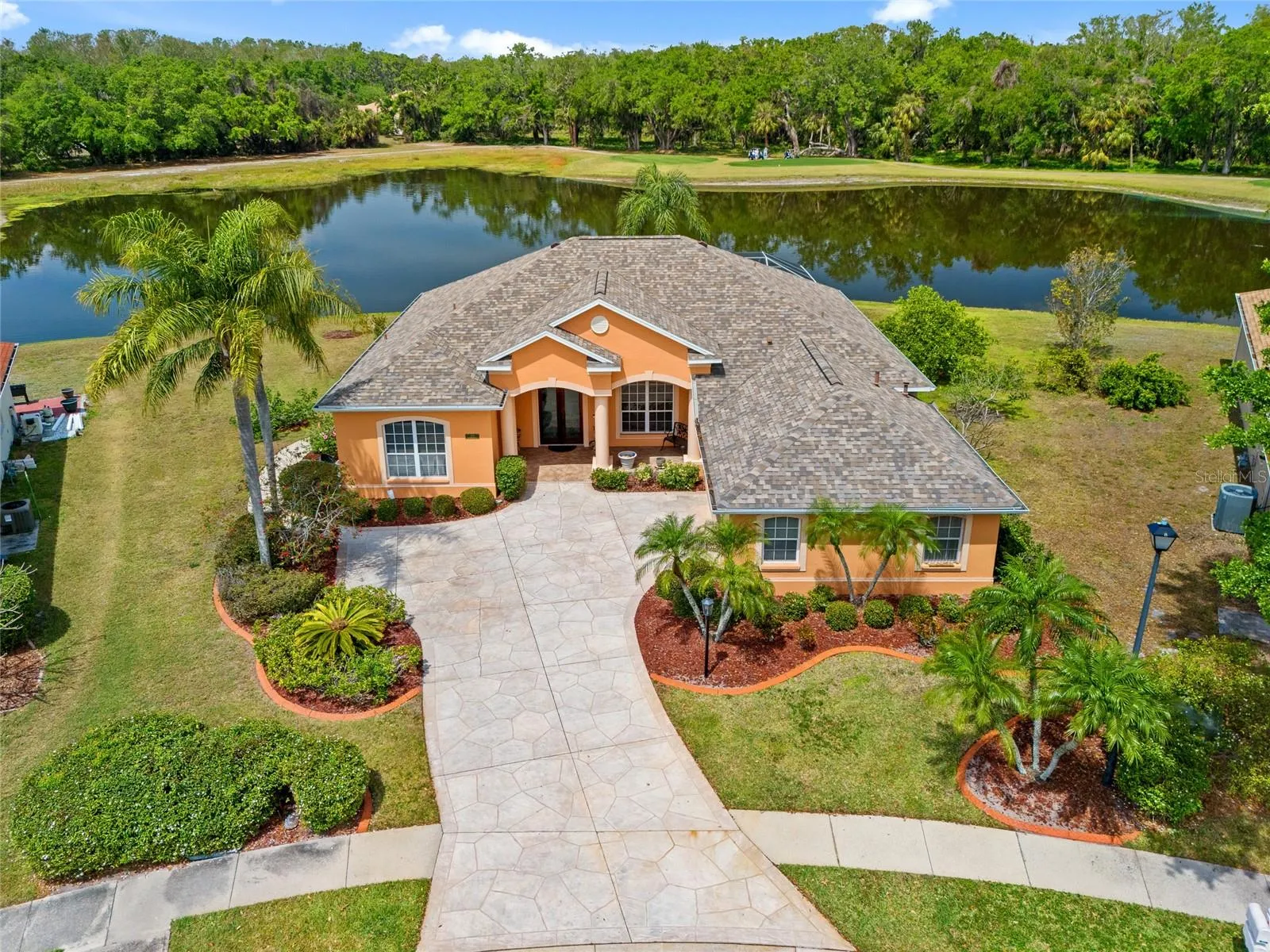 PLANTERS MANOR AT GREENFIELD PLANTATION! This beautifully maintained 3 bedroom plus office, 2.5 bath pool home on an oversized lot offers spectacular water and golf course views. From the moment you arrive, the home welcomes you with a covered front porch and elegant double glass front doors. A spacious 2-car side-entry garage completes the exterior, surrounded by mature, lush landscaping that enhances the home’s curb appeal. Step inside to an open and airy floor plan with high ceilings, arched entryways, crown molding, ceramic tile and hardwood flooring, formal dining room, and formal living area with large slider to lanai and exceptional views. The home boasts a functional split floor plan, offering privacy and convenience. In addition to the 3 bedrooms, the office provides the perfect space for remote work or additional flexibility. The formal dining room is perfect for hosting guests, while the kitchen features granite counters, stainless appliances including gas range, center island with sink perfect for prepping meals and breakfast bar. The intimate dining nook with large aquarium window overlooks the family room with pocket slider to enjoy the serene lake views. The primary suite is a peaceful retreat offering 2 walk-in closets, slider to lanai and private en-suite with dual vanities, garden tub and walk-in shower. The outdoor entertaining area features covered lanai, convenient half bath, screened gas heated pool and spa, outdoor patio area for grilling and northwestern exposure to enjoy amazing sunsets. Low HOA and no CDD. Fantastic location close to I-75, restaurants, shopping at Heritage Harbour, schools, parks and home to public pay-to-play Links at Greenfield Plantation Golf Course. Easy access to fishing and boating on the Manatee River and relaxing on Bradenton beaches. Don’t miss the opportunity to make this well-maintained home with incredible views yours today!