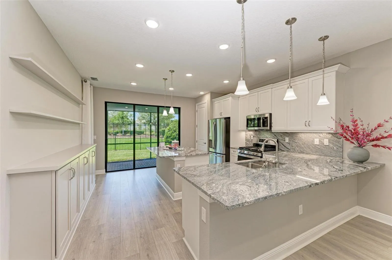 This meticulously designed 2-bedroom, 2-bath home with an additional den sits on a beautifully landscaped lot, complete with a fenced backyard, perfect for pets. The owner’s bathroom features an oversized walk-in shower, dual sinks, and a spacious walk-in closet. The home is packed with upgrades, including extra lighting, an extended screened lanai, upgraded appliances, surround sound in the living and bedrooms, a security system, whole home gutters, and a home water filtration system.