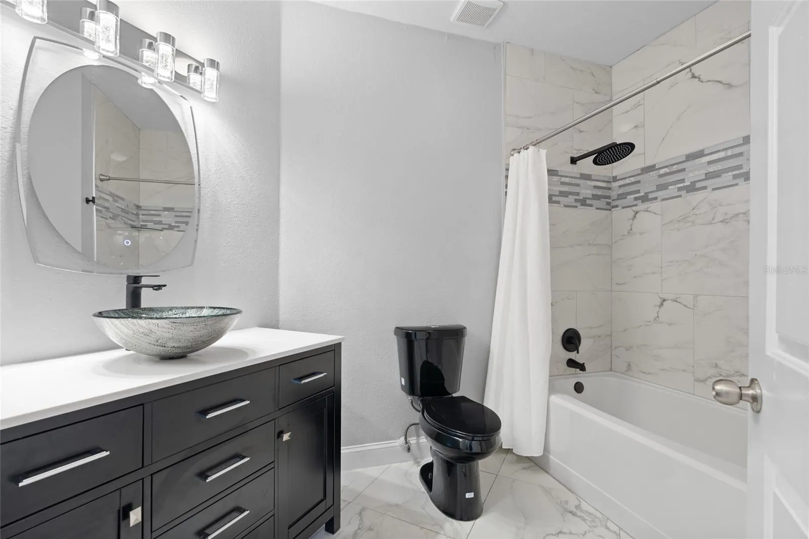 Both bathrooms have been transformed into spa-like retreats with marble-tiled showers, rain shower heads, LED-lit vanities, mirrored shelving cabinets, and waterfall vessel sinks. The primary suite takes it a step further with a luxurious multi-head shower system and a spacious walk-in closet.