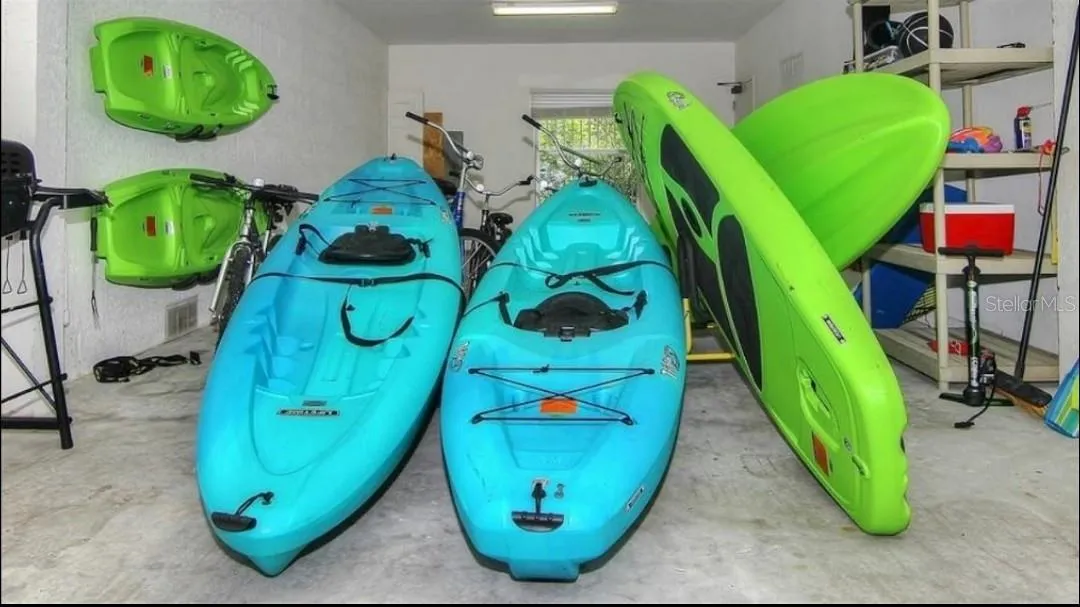 This home also includes a private 2-car tandem garage with ample storage space for cars, golf cart, bicycles, kayaks, and paddleboards. The beach gear, kayaks, paddleboards, and bicycle CONVEY with the sale!