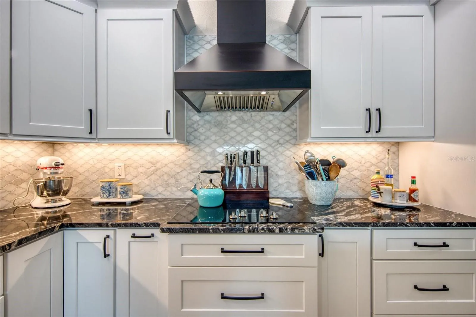 space, showcasing a gourmet kitchen adorned with Thermador Appliances, granite countertops, a marble backsplash, and custom wood cabinets with