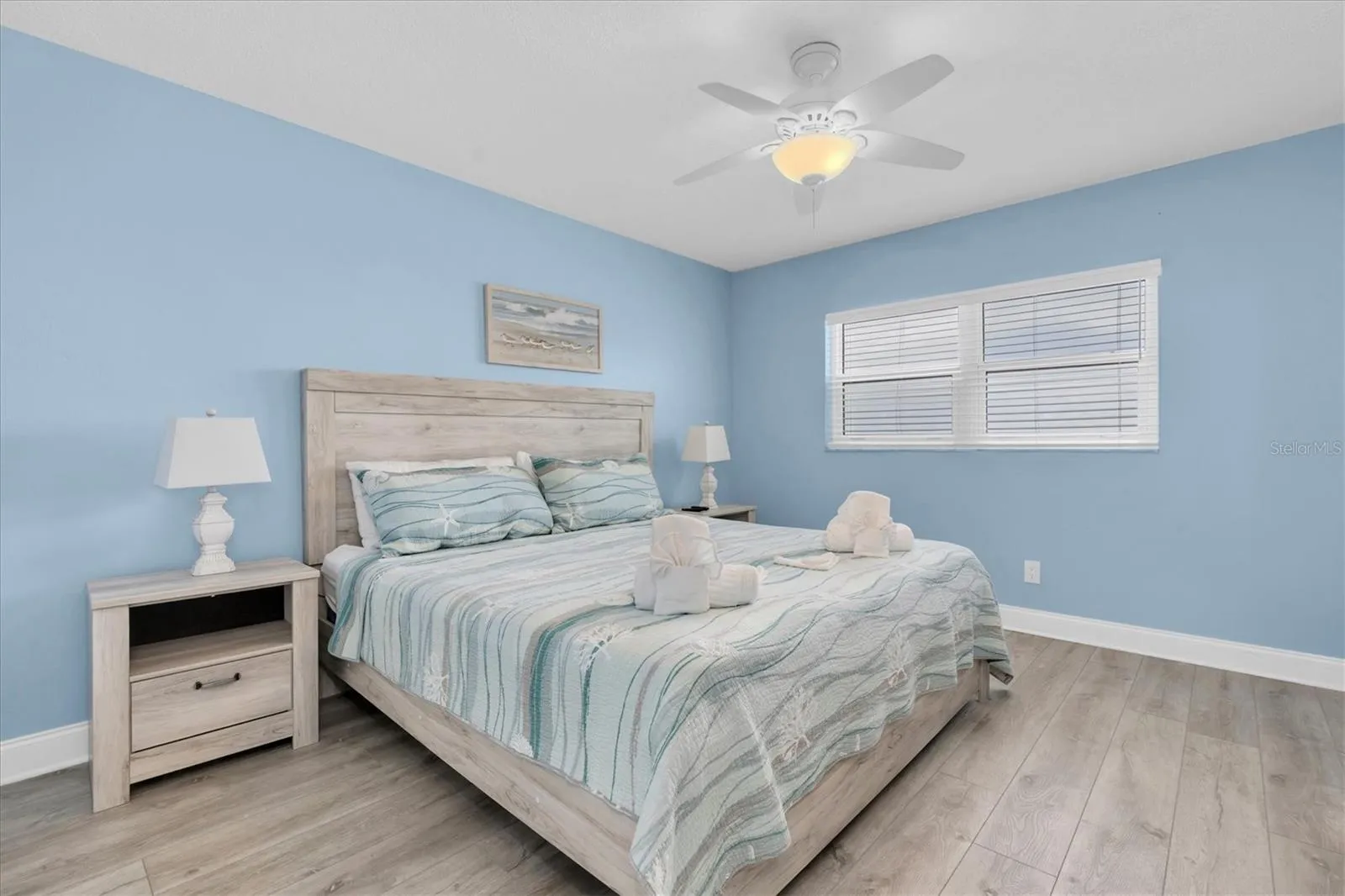 Inside, the coastal inspired design features a modern kitchen with quartz countertops, tiled backsplash, and a generous breakfast bar. Luxury vinyl flooring flows throughout, complemented by hurricane-rated windows and sliding doors (2023) and a new A/C system (2023) for year round comfort. The convenience continues with an in unit washer and dryer (2023) plus additional laundry facilities on the first floor.