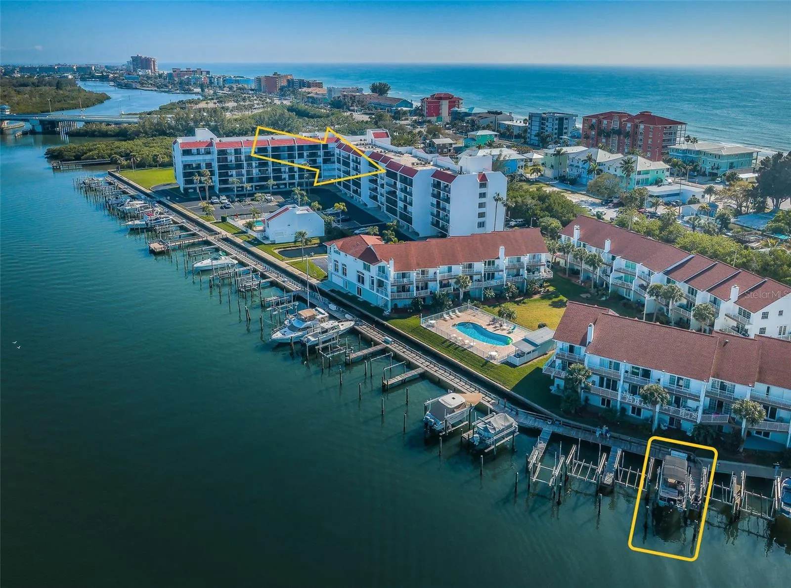 TOP FLOOR being sold Furnished/Turnkey with water views from every vantage point! A private boat slip with a lift, hurricane shutters, impact windows west side (triple glazed impact), Storage Closet for Beach Items and so much more can be yours at this breathtaking TURNKEY (lots of great items) unit, located steps from the gulf beaches – a rare find with amazing Intracoastal views on the east side AND stunning gulf views on the west side. The lovely kitchen is lined with wood cabinets, granite countertops, and a custom pantry with plenty of storage – perfect for whipping up beach day snacks. Soak up the stunning beach view from the kitchen table, providing a pleasant dining view no matter the season. The kitchen and dining area opens up to the living area, with sweeping views of the Intracoastal waterway and access to the SCREENED balcony overlooking the Intracoastal, providing you with additional living space and endless hours of enjoyment. The spacious master bedroom en-suite also boasts private balcony access and wall-to-wall closets fit for any sized wardrobe. It currently has a king-bedroom set with plenty of room to spare! The 2nd bedroom has picturesque gulf views, fitted with custom cabinets, a desk, and a murphy bed; it’s a perfect use of space! The unit has two assigned parking spots, one under building and an additional tandem spot. The community has 41 guest parking spots! Vista Bay is an extraordinary community and is buffered on the South by Town Square Nature Park and just steps to the beautiful Indian Shores Beach! Lighted Tennis Courts, Pickleball, Shuffleboard, Waterside Grilling area, Fishing Pier, Dock, Resident Car Wash, and Heated Swimming Pool all on a spacious 3-acre waterfront lot – an amazing find on the barrier islands! One pet permitted 20 pounds or under. Rental policy is a minimum of 3 months, with a maximum of twice a year. You are 3.5 miles to Seminole City Shopping Center, a premier community destination offering a wide array of shopping, dining, theater, plus health and wellness options. You are only 35 minutes to downtown St. Petersburg, the pier, museums, art galleries, shopping, dining & breweries. Close by are local favorites Muhuffers Bar & Grill featuring live music & filled with eclectic rustic treasures. Upscale Salt Rock Grill is a 5-minute walk from here. A waterfront life beyond your wildest dreams awaits! NEW $17,457 Lennox AC 5/2024.