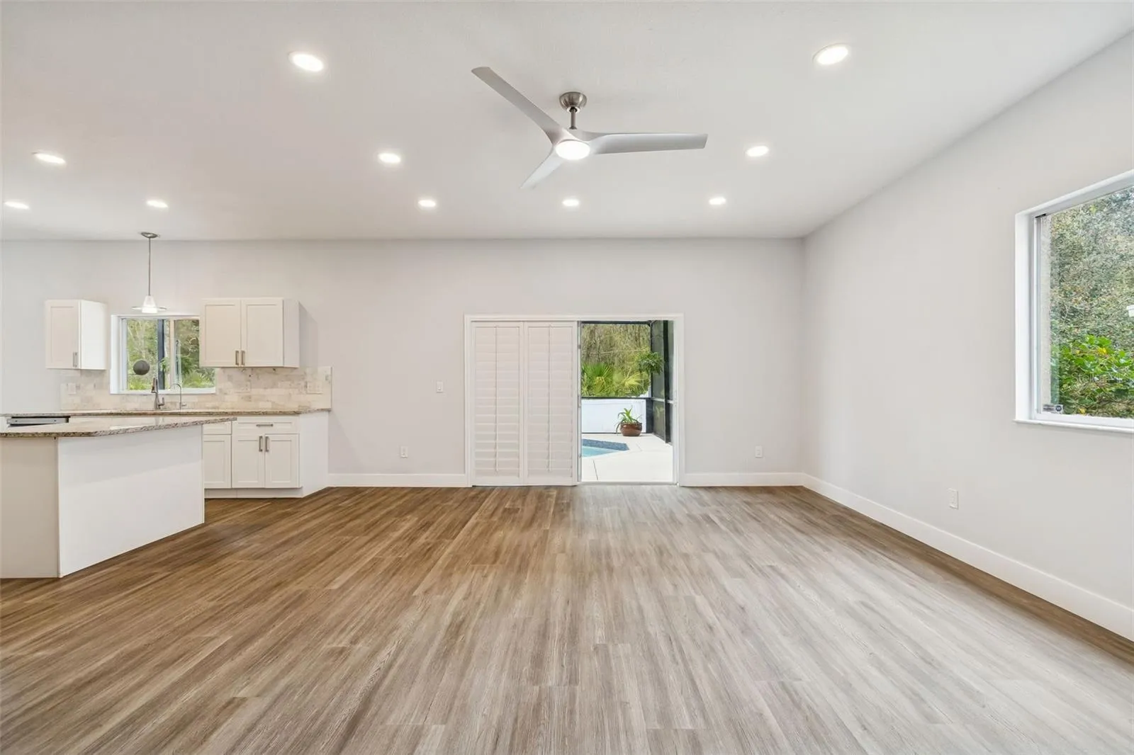 Large pool home overlooking peaceful conservation view. As you enter, you will feel the warmth of this light and bright floor plan and will be greeted by soaring 20’ ceilings in the grand dining/living room. Cooking enthusiasts will be delighted with the eat-in kitchen featuring granite countertops, undermount sink, staggered maple cabinets, stainless steel appliances, and walk-in pantry, and open to the spacious family room – a perfect space for entertaining or spending family time together. Be creative with the Butler’s pantry that you can turn into a workspace, Barista station or bar area. Walk up the wooden staircase, & you’ll find a marvelous multipurpose bonus room that would make a great game/media room, home office or even teenage hangout, plus 3 large bedrooms with walk-in closets. NEW ROOF put on in 2026. No flood insurance required! Look at pics of the community resort style pool — family and friends will LOVE visiting you in Florida.