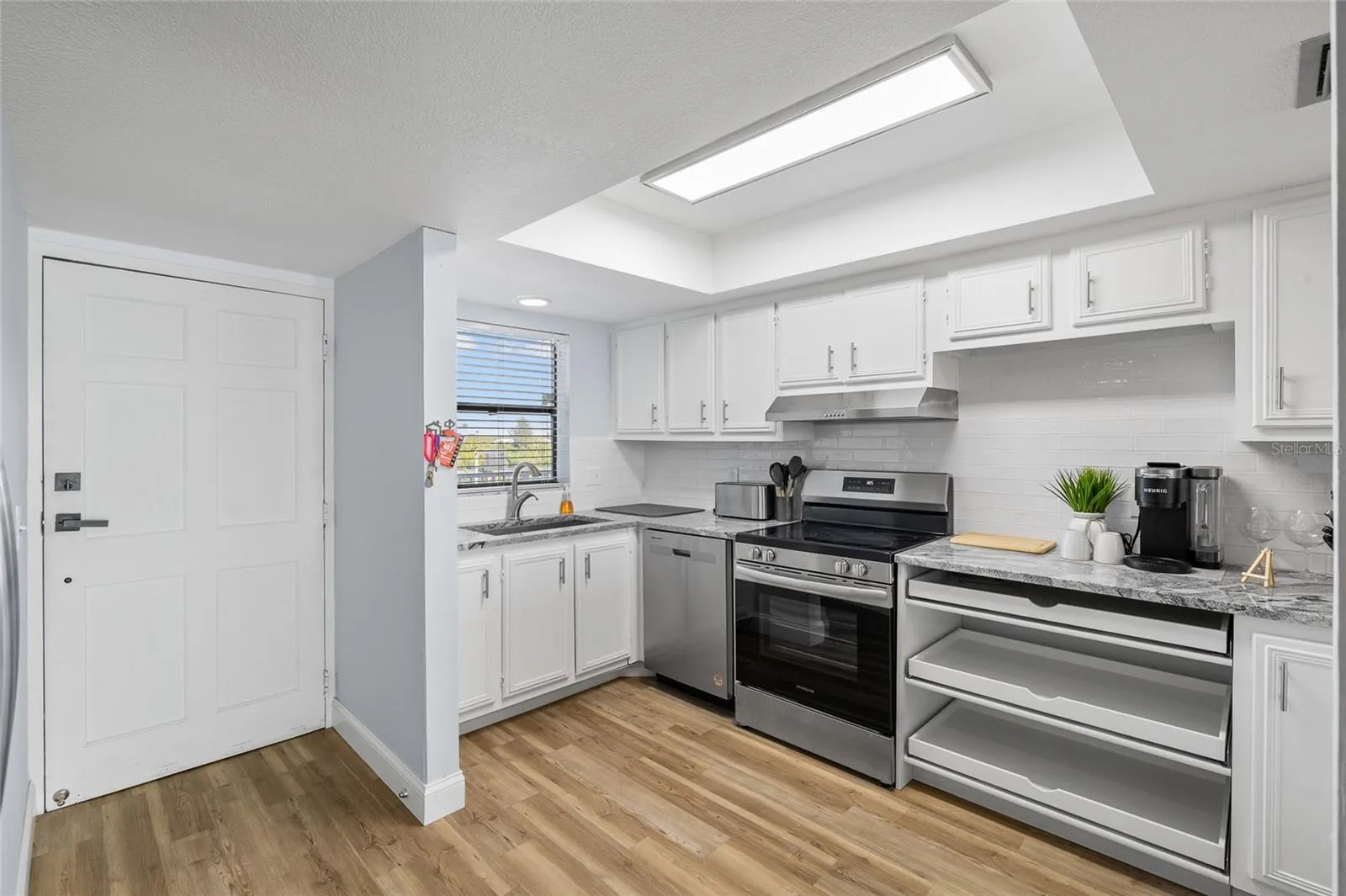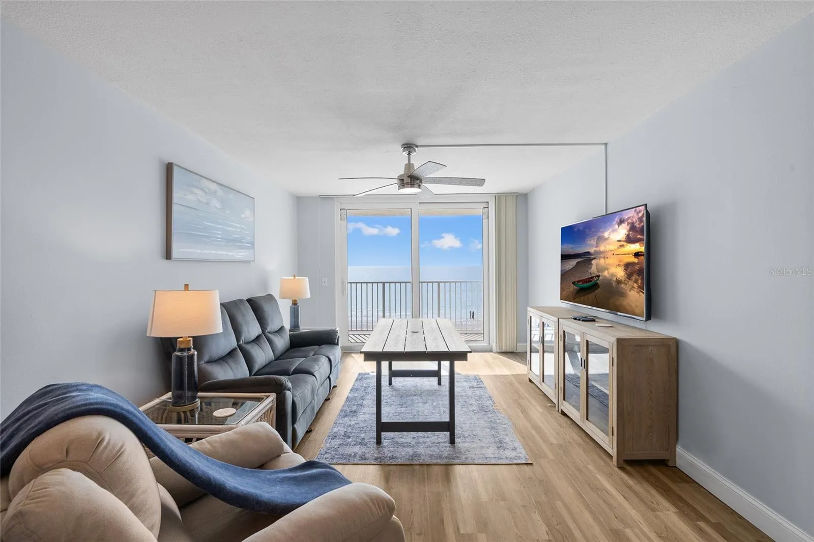Step inside to find luxury vinyl plank flooring throughout, a modern open kitchen with quartz countertops, and a custom backsplash that elevates the coastal aesthetic. The condo also features brand new hurricane-rated sliding doors (2025), updated bathrooms, and an in-unit all-in-one washer/dryer for added convenience.